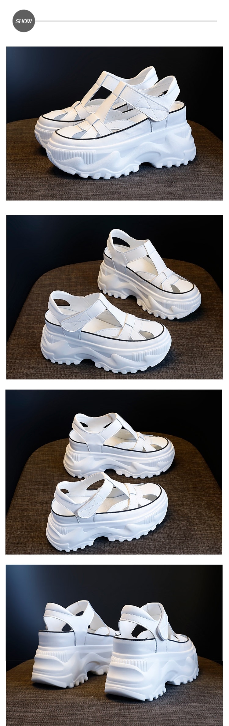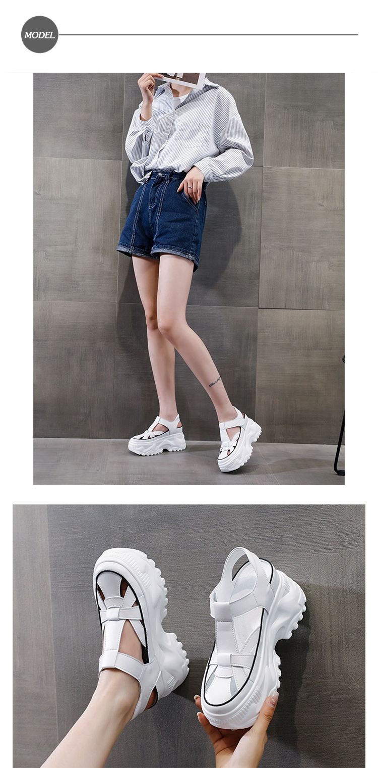 【HMH】真皮T字帶內增厚底涼鞋/真皮縷空線條T字帶魔鬼粘內增高美腿效果厚底涼鞋 女鞋 白