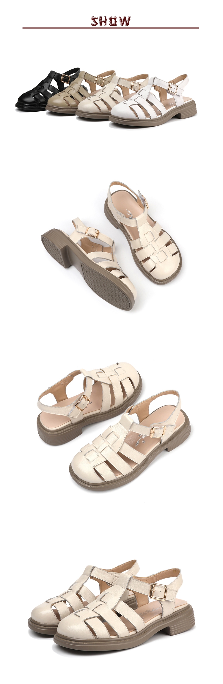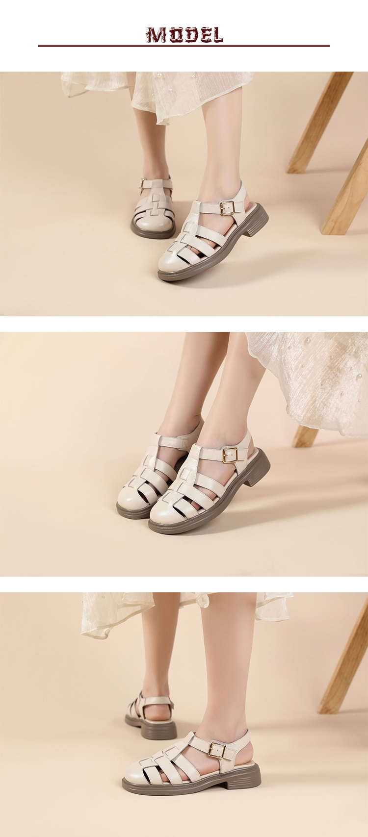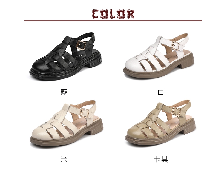 【WINK】真皮包頭低跟羅馬涼鞋/真皮百搭縷空線條包頭低跟羅馬涼鞋 女鞋 米