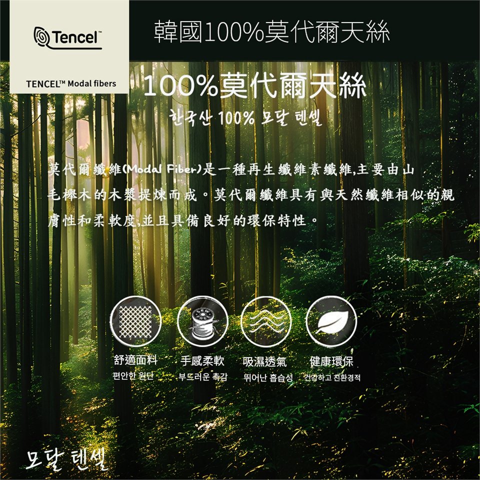 莫代爾纖維是從櫸木木漿中提取的再生纖維,觸感介於純棉與絲綢之間。