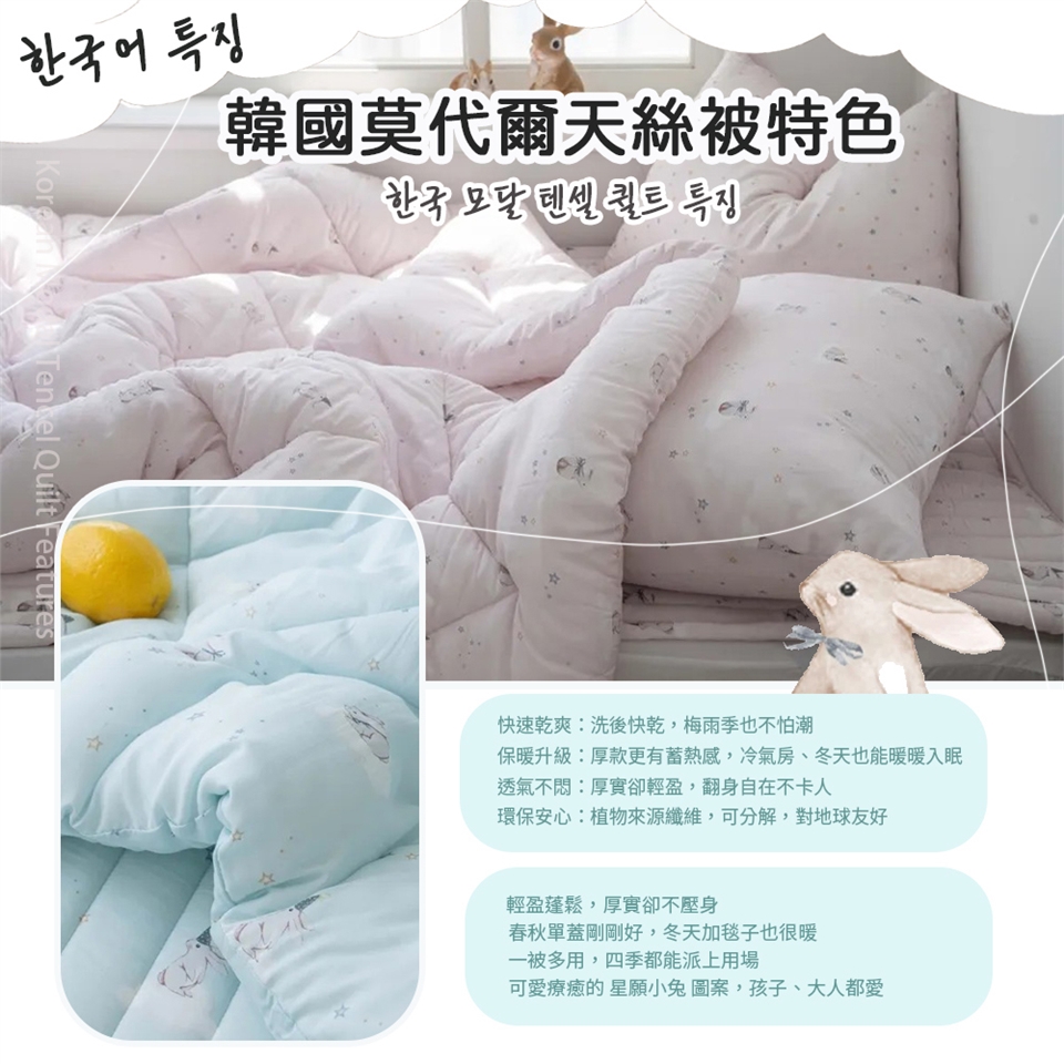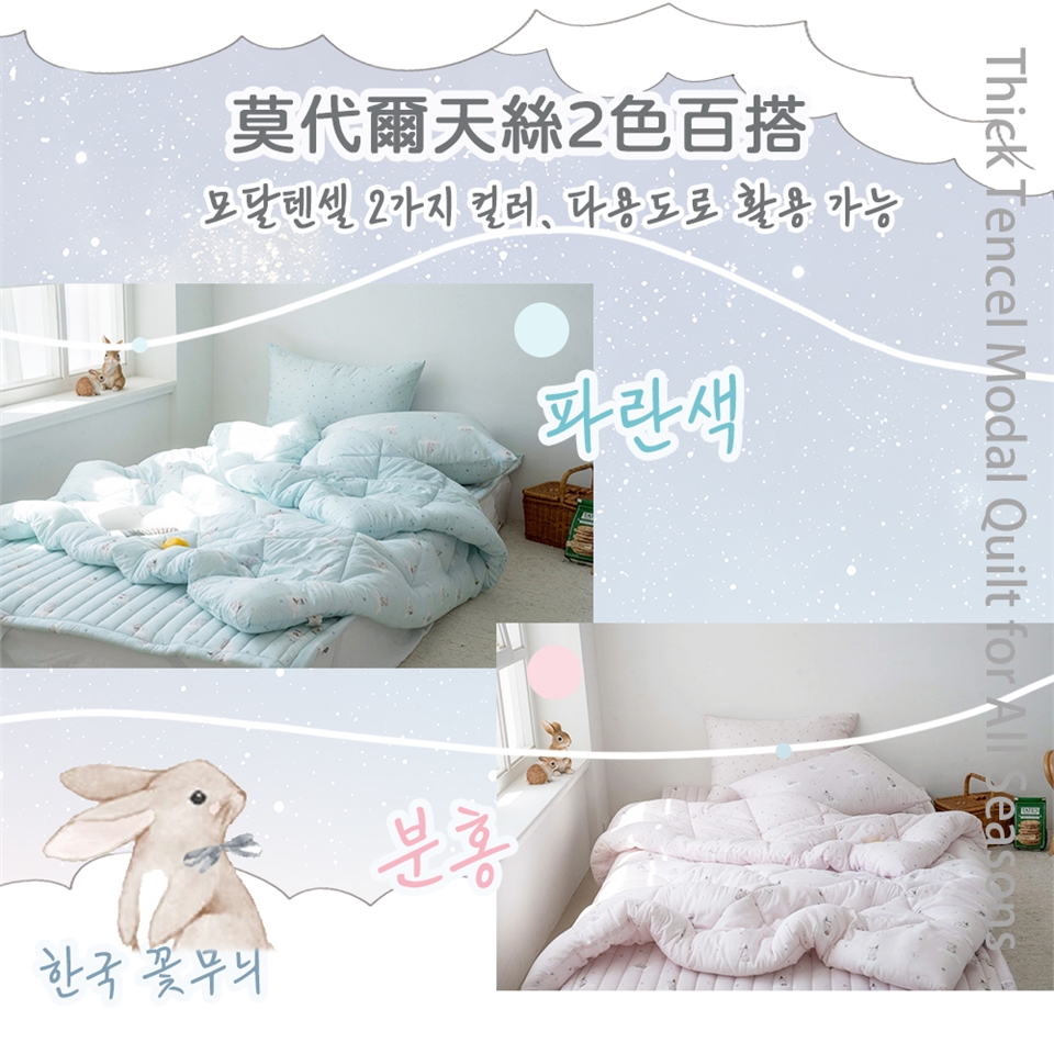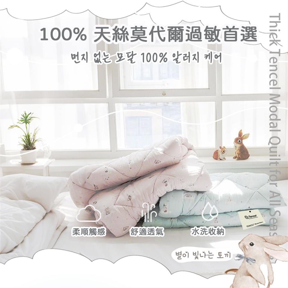 防塵蟎效果: 韓國莫代爾棉被通常會搭配高密度織法,具備一定的物理性防塵蟎效果,對鼻過敏族群很友善。
