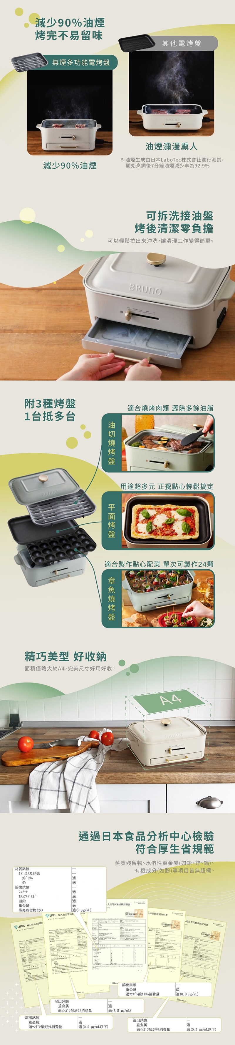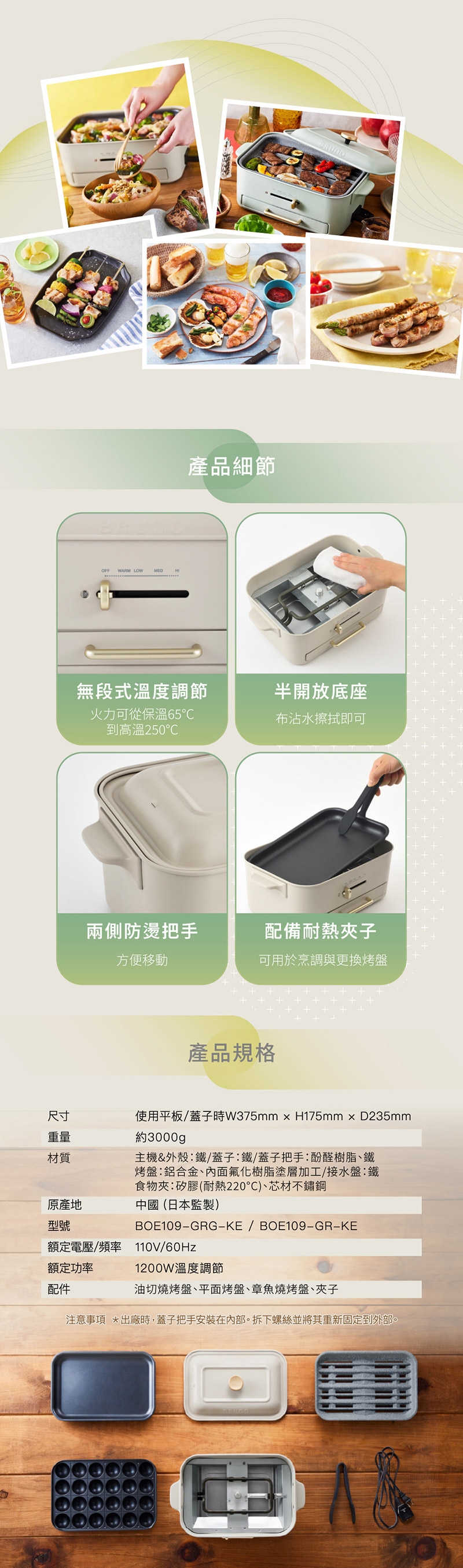 ◆機器內附3種烤盤(低煙烤盤、平面烤盤、章魚燒烤盤),燒烤肉類、正餐點心配菜一組搞定。