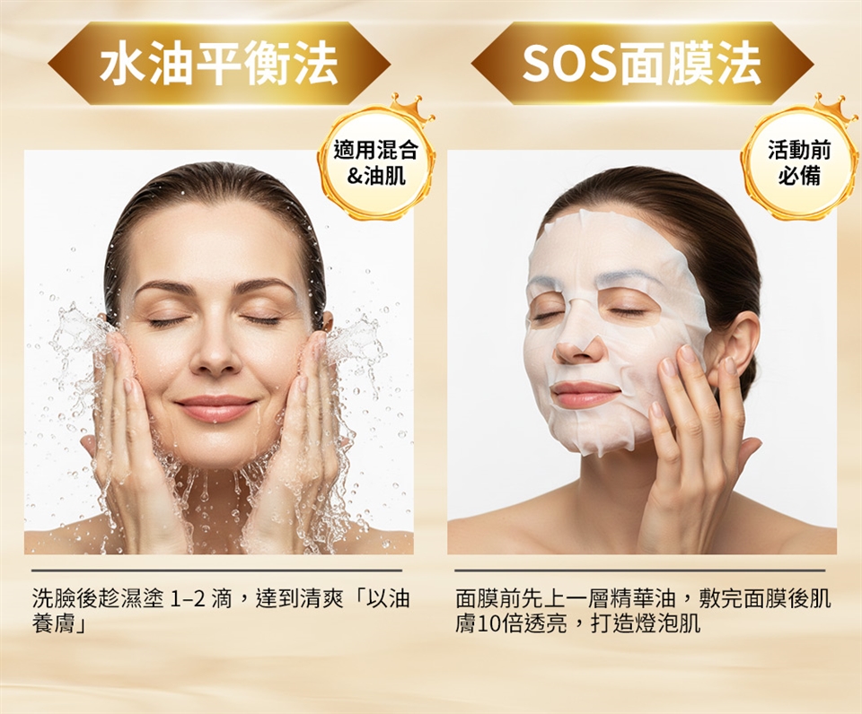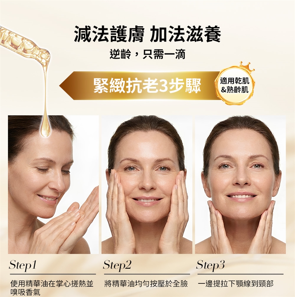 滴適量於手心摩擦產生微溫後,再按摩肌膚