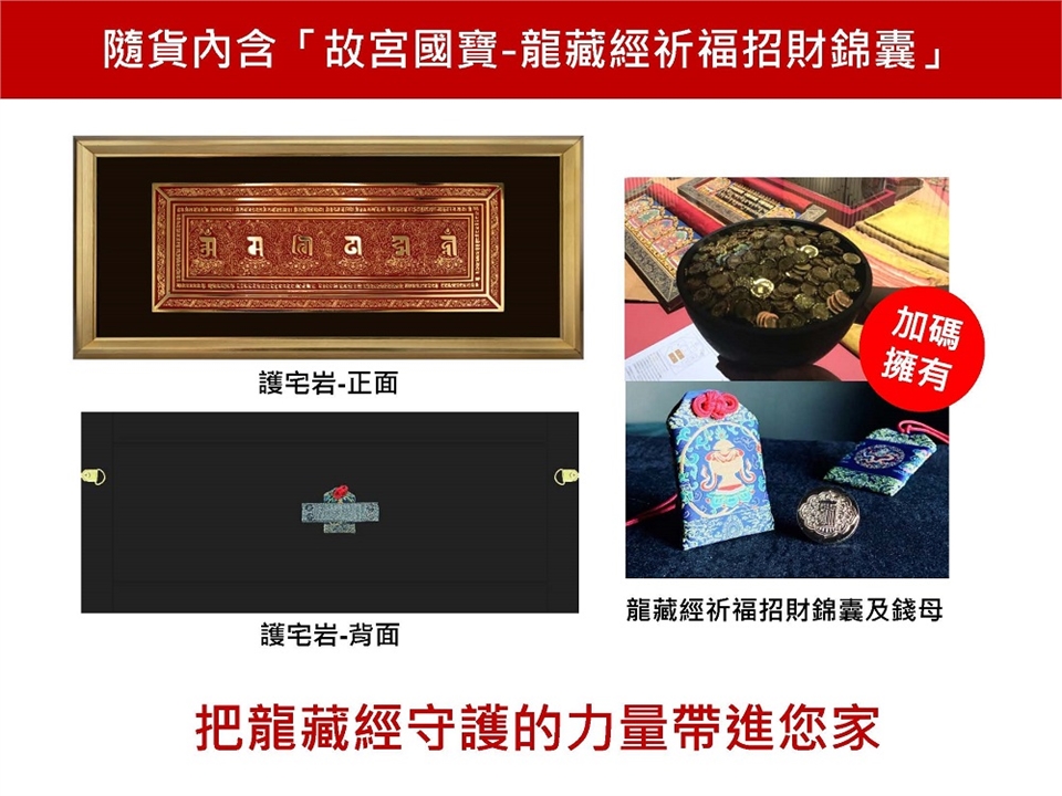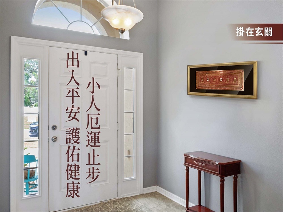 ★將錦囊置放於六字大明咒護宅岩背面,使用彈性束帶將其固定,並默念《六字大明咒》七遍,祈請 龍藏經無上護法庇祐家宅。