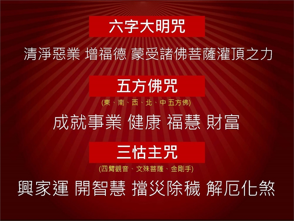 ★黃財神心咒:嗡。臧巴拉。札楞札耶。梭哈★六字大明咒:嗡。嘛。呢。叭。咪。吽