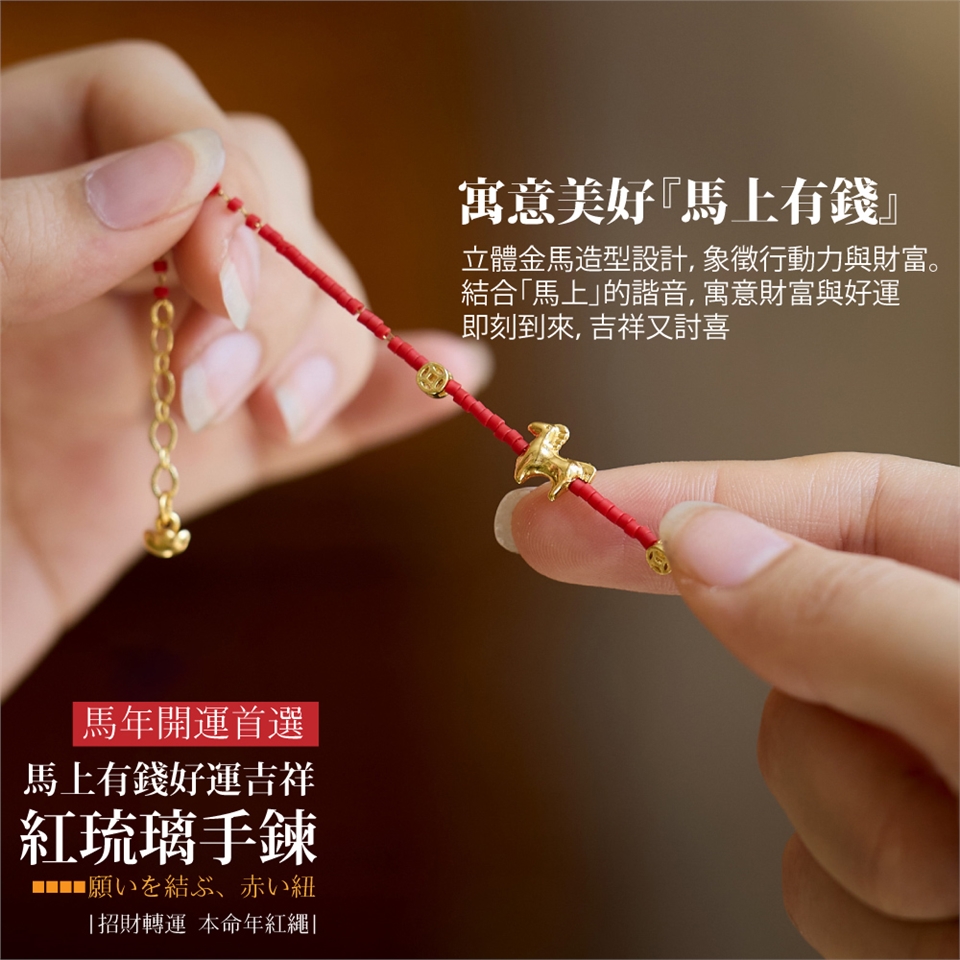 手鍊主角是一隻昂首的金色小馬,寓意「馬到成功」,腳下與身旁點綴著古錢幣