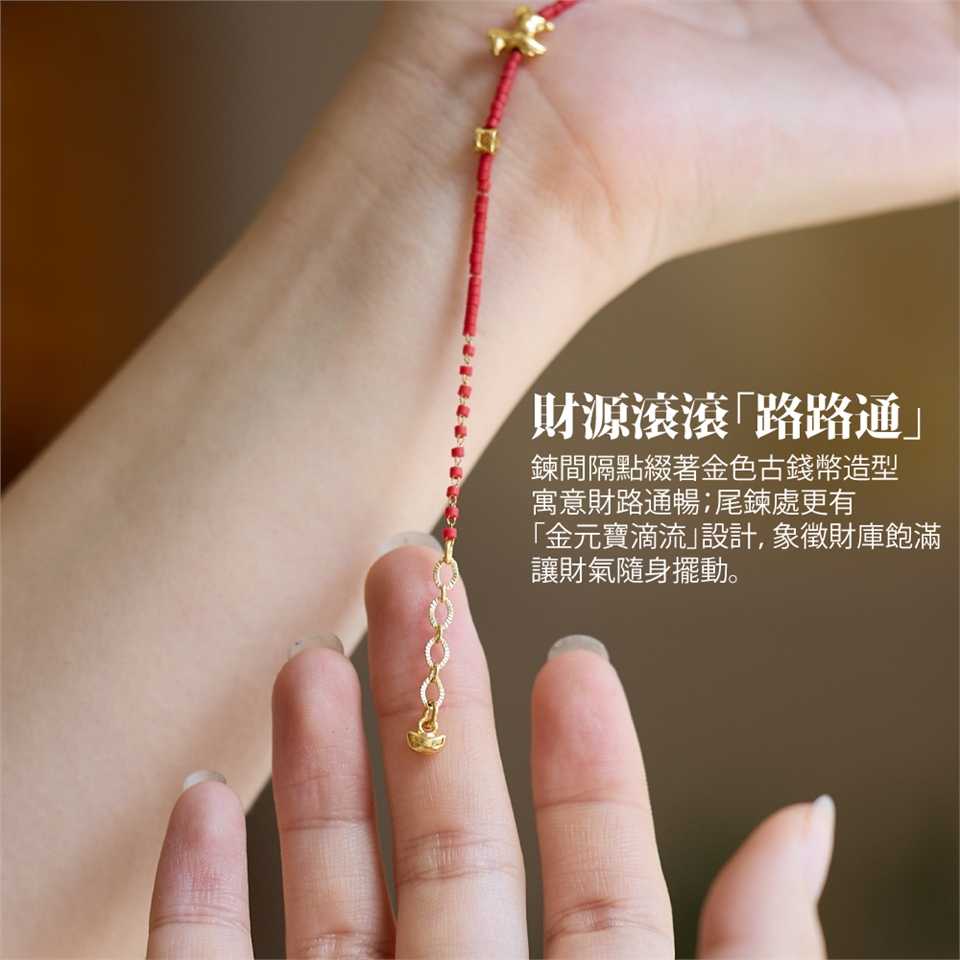 手鍊間隔點綴著金色古錢幣造型,寓意財路通暢;