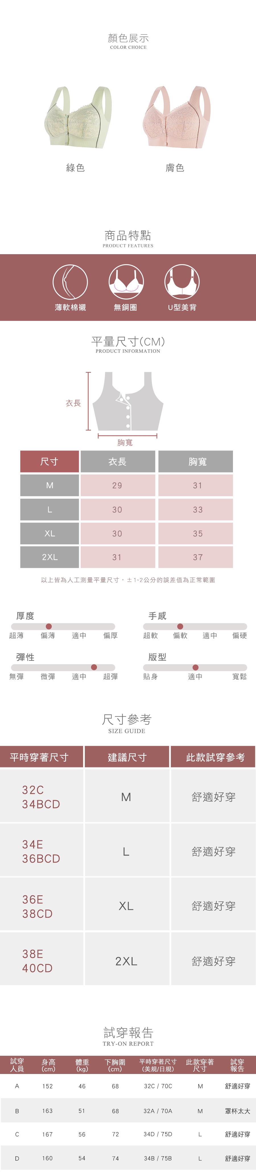 ◆商品有10天審閱期(注意!鑑賞期非試用期) br◆如需退換貨請保持商品完整,(包含購買商品、附件、內外包裝、贈品等)請一併寄回,否則將會影響退貨權限。 br◆內衣褲屬貼身物品,辦理退換貨時,除商品本身瑕疵外,一經剪標或下水恕不接受退換貨。 br◆網頁商品會因為使用不同的品牌螢幕以及解析度不同,造成圖片顏色呈現略有不同,請以實品顏色為準。 br◆本尺寸對照表標示僅供參考,實際尺寸以實品為準。 br◆請用中性洗潔劑冷水手洗,洗淨後請輕扭後置於陰涼處晾乾。請勿使用漂白劑。