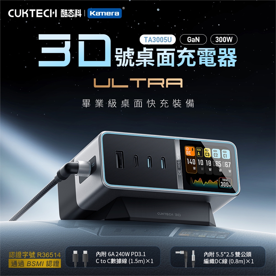 包裝內容:30號Ultra 300W 桌面充電器×1、底座×1、Type-C to Type-C充電線×1、DC充電線×1、3孔AC電源線×1、使用說明書×1