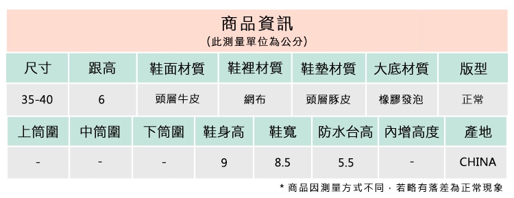 2.鞋類商品依功能及用途之不同,鞋底各有其止滑係數之個別不同,使用鞋類商品請用於正常平坦之路面,非雨鞋或雨靴類商品,請避免穿著於下雨濕滑路面上行走。