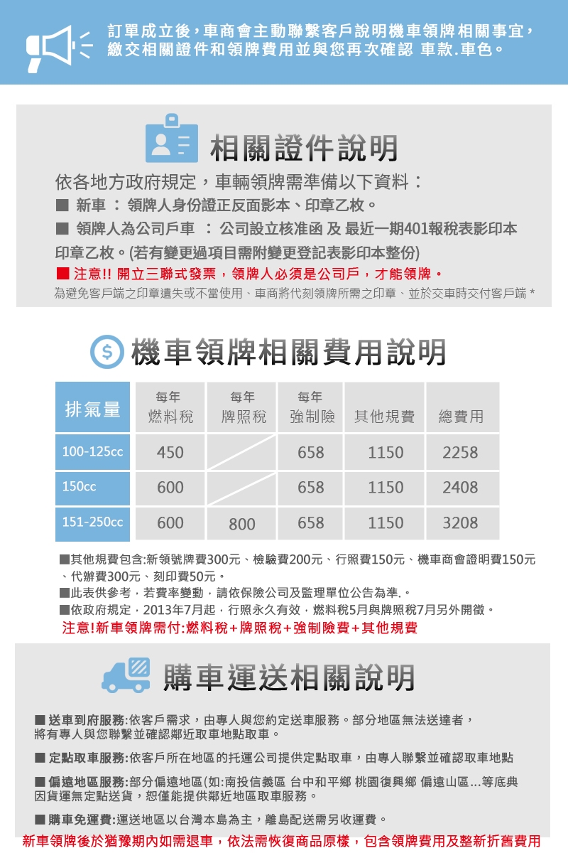 流程問題 :br.須自付燃料稅、領牌費、強制險費用等。br.車牌號碼恕不提供選號(除自費選號)。br.購買後將有專人為您說明證件寄送及辦、領車等流程問題。br.客需提供辦理相關資料寄至廠商處,以便辦理領牌作業br.廠商收到資料及費用後,統一由光陽機車供貨商代客在新北市辦理領牌作業。br.領牌完成後,由出貨廠商與您連絡約定送貨時間。br.一經領牌,恕無法辦理退貨,購買前請詳加確認您的需求。 br.以您繳交費用及證件齊全後算起,交車時間約為7日工作天左右(除開學季,或天災,不可抗命之因素等等可能延長交車時間,請客見諒)br.宅配到府僅限台灣本島宅配到府,部分偏遠縣市(花蓮、南投)和山區採定點取車方式。