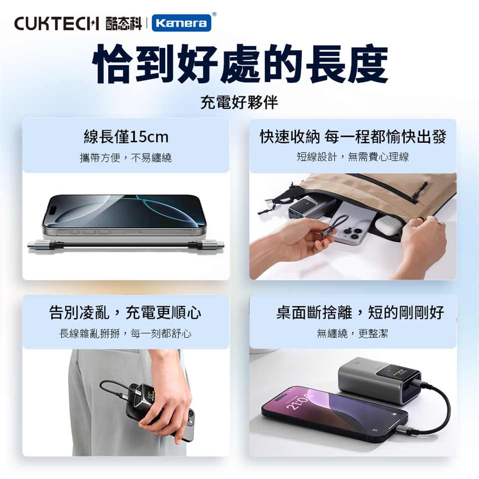 僅 15cm 長度,專為行動電源、車充、筆電側邊等近距離充電設計,減少纏繞與凌亂。