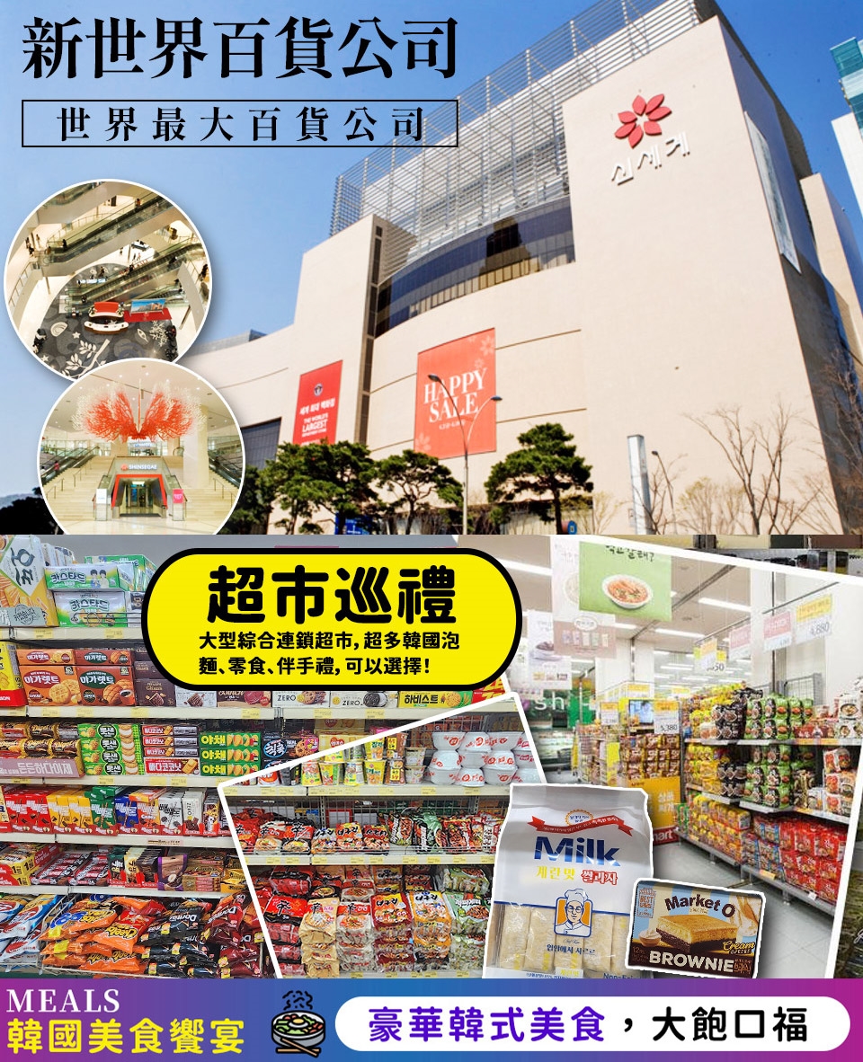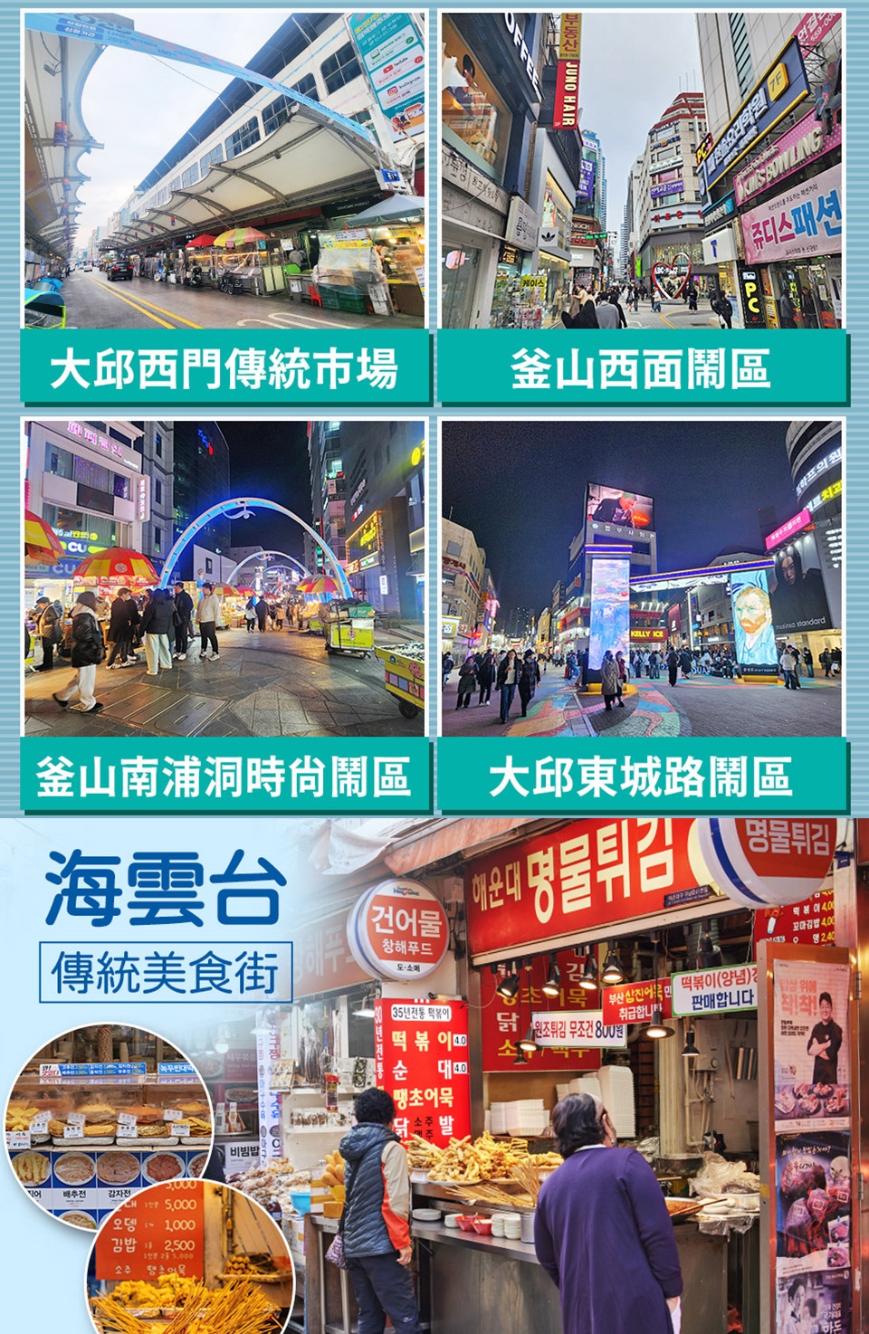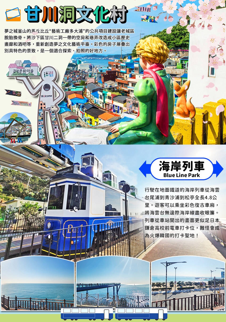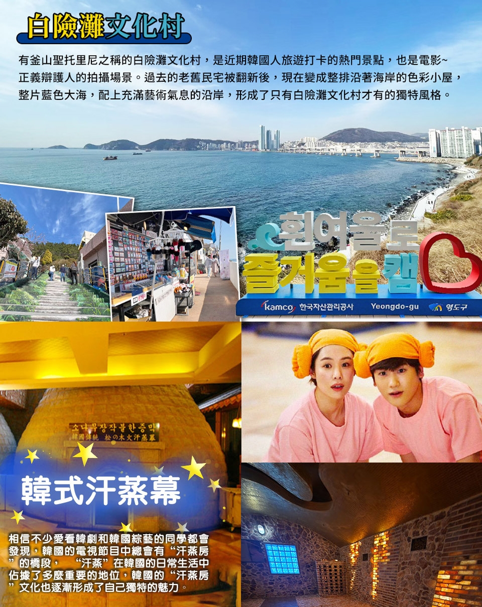 【甘川洞文化村】夢之城釜山的馬丘比丘“藝術工廠多大浦”的公共項目建設讓老城區脫胎換骨。將甘川二洞一帶的空房和巷弄改造成小區歷史畫廊和酒吧等,重新創造夢之文化藝術平臺。彩色的房子層疊出特色的景致,是一個適合探索拍照的好地方。 【韓國彩粧名品店】相信愛美的女人們一定可以在這挑選最新款最hito彩粧品,而除了購買外,部份店家特別提供免費彩粧教學讓辛苦上班族及學生族群在忙碌生活中,一樣可以打造出時尚流行彩粧,讓您永遠跟上時代潮流尖端。 【新世界百貨公司(世界最大百貨公司)】列入金氏世界紀錄《世界最大百貨公司》,與其說百貨公司,說是一個小城市也不誇張;購物城內無奇不有,要什麼有什麼。藝廊、溜冰場、公園、文化中心等各種優閒娛樂空間,應有盡有,深受觀光客及全家同樂的遊客喜愛。此外,全球最新流行產品的各大知名名品店入駐,是身為購物狂的您千萬不可錯過的好地方。依照四季與季節不同,還舉辦有各種時裝秀以及其他各種多采多姿的活動,到訪前不妨事先跟百貨公司確認活動表演時間表。Centum City 歷史雖短,但由於其名聲遠,因而使其立即躍身成為《購物必訪之地》。 【白險灘文化村+絕影海岸散步路】有釜山聖托里尼之稱的白險灘文化村。是近期韓國人旅遊打卡的熱門景點也是電影~正義辯護人的拍攝場景。過去的老舊民宅被翻新後現在變成整排沿著海岸的色彩小屋整片藍色大海配上充滿藝術氣息的沿岸形成了只有白險灘文化村才有的獨特風格穿梭在不同的小巷中偶爾會發現意外的拍照景點往下走到海灘旁還能欣賞到特殊的石頭海灘景色叉沿岸有許多特色咖啡廳隱藏在民宅中走累了可以挑一家進去喝杯咖啡配上整片蔚藍的海景真的很療癒啊! 【西面鬧區】釜山明洞之稱~西面,最大也最熱鬧的購物區,"西面1號街"是指從舊天佑莊至LG服務中心之間的一條寬8m、長330m的街道,位於釜山市釜山鎮區,是西面繁華的街道,以藝術街聞名。以"西面1號街"大型標誌為中心,四周聚集了許多酒吧和咖啡館。燈光絢爛的酒吧、美食街,總是充滿快樂、熱鬧的氛圍。 早餐:飯店內 午餐:蟹蟹傳說~長腳蟹吃到飽+蟹膏炒飯+蟹肉羹+海鮮盤 晚餐:【韓國藍絲帶認證】松亭三代豬肉湯飯+韓式小菜+長壽麵 |