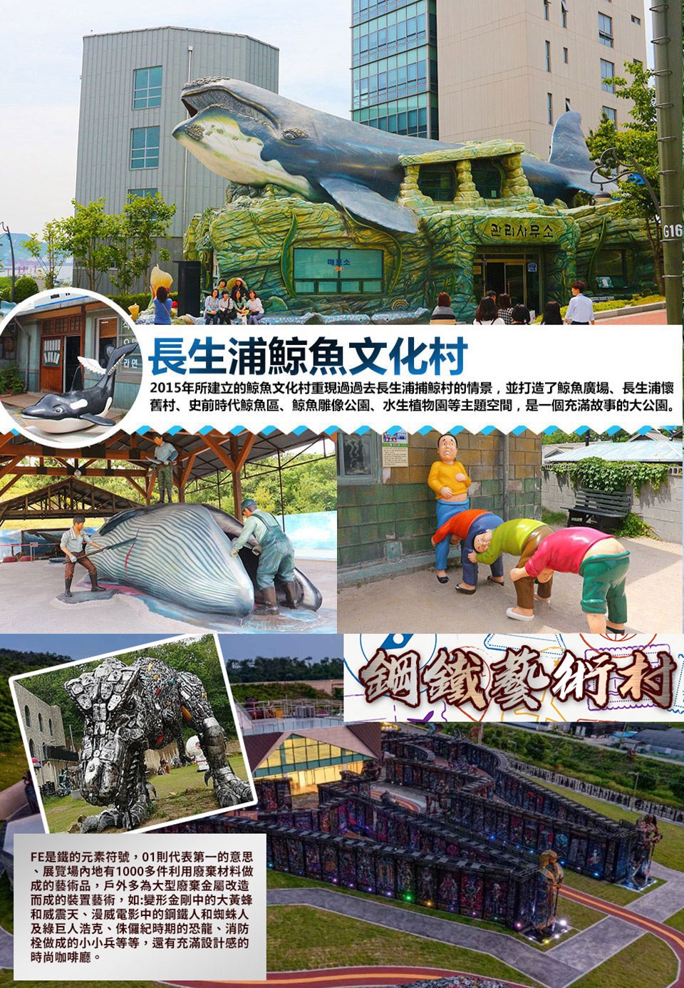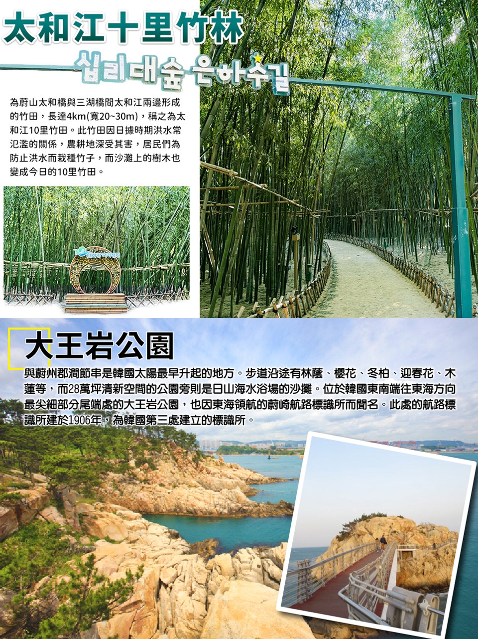 | 【太和江十里竹林】為蔚山太和橋與三湖橋間太和江兩邊形成的竹田,長達4km(寬20~30m),稱之為太和江10里竹田。此竹田因日據時期洪水常氾濫的關係,農耕地深受其害,居民們為防止洪水而栽種竹子,而沙灘上的樹木也變成今日的10里竹田。 【大王岩公園】與蔚州郡澗節串是韓國太陽最早升起的地方。步道沿途有林蔭、櫻花、冬柏、迎春花、木蓮等,而28萬坪清新空間的公園旁則是日山海水浴場的沙攤。位於韓國東南端往東海方向最尖細部分尾端處的大王岩公園,也因東海領航的蔚崎航路標識所而聞名。此處的航路標識所建於1906年,為韓國第三處建立的標識所。此處的松竹園可免費租借房間,提供製造美麗回憶的民宿。從公園入口處道燈塔約有600m的蔭鬱松林步道,百餘年樹齡的大松樹提供了舒適幽靜的樹蔭。 【大王岩吊橋】是蔚山的第一座吊橋,全長303公尺的吊橋,銜接了大王岩公園內的兩條海岸步道「Hatgaebi」與「Surubang」。整座吊橋採中間無任何支柱支撐,一次連接的方式,是目前全韓國各地吊橋中跨距長度最長的吊橋。由於吊橋延伸至海上,方便遊客飽覽大王岩周邊的海岸秘境,留下刺激又難忘的回憶。 【長生浦鯨魚文化村】2015年所建立的鯨魚文化村重現過過去長生浦捕鯨村的情景,並打造了鯨魚廣場、長生浦懷舊村、史前時代鯨魚區、鯨魚雕像公園、水生植物園等主題空間,是一個充滿故事的大公園。 【FE01鋼鐵藝術村】FE是鐵的元素符號,01則代表第一的意思、展覽場內地有1000多件利用廢棄材料做成的藝術品,戶外多為大型廢棄金屬改造而成的裝置藝術,如:變形金剛中的大黃蜂和威震天、漫威電影中的鋼鐵人和蜘蛛人及綠巨人浩克、侏儸紀時期的恐龍、消防栓做成的小小兵等等,還有充滿設計感的時尚咖啡廳。 【艮絕岬燈塔+希望郵筒】位是韓半島太陽最先升起,能許下新年願望的艮絕岬海邊路,從鎮下明仙橋入口沿著海岸至新岩港為止,總長10公里,分為愛情、浪漫、幸福等五條主題路線。可實際寄送郵件的希望郵筒高5公尺,為當地著名造型物,郵筒後方有入選優美燈塔16景的艮絕岬燈塔與大型風車。