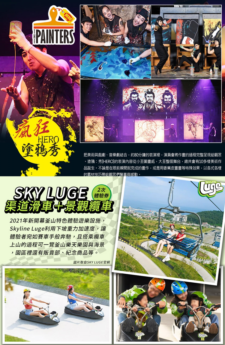 【Blue Line Park海岸列車(2022年全新景點)】行駛在地面鐵道的海岸列車從海雲台尾浦到青沙浦到松亭全長4.8公里。遊客可以乘坐彩色復古車廂,將海雲台無邊際海岸線盡收眼簾。列車從車站開出的畫面更似足日本鎌倉高校前電車打卡位,難怪會成為火爆韓國的打卡聖地! 【海雲台傳統美食街】在此可四處遊覽並享受購物的樂趣,飯捲、辣炒年糕等各式各樣的美食,以及豐富的生活雜貨,令人流連忘返。 【五六島天空步道(Sky Walk)】景點就建在海岸散步道的最南端,為可遠眺五六島的最佳地點。釜山海上天空歩道“Sky Walk”呈U字型跨入海面長達12~13公尺,高度與實際海面僅距離約40公尺。 【SKY LUGE渠道滑車+景觀纜車(二次體驗券)】2021年新開幕釜山特色體驗遊樂設施,Skyline Luge利用下坡重力加速度,讓體驗者宛如賽車手般奔馳,且搭乘纜車上山的過程可一覽釜山樂天樂園與海景,園區一共有四條路線,相加起來總長約2.4公里,園區會依照當日的旅客量來決定開放兩條或四條賽道。斜坡滑車操作簡單,都會有專員先教學如何控制滑行、停止及方向操作,園區裡還有販賣部、紀念商品等。 釜山LUGE斜坡滑車注意事項 •斜波滑車體驗每人2次,遇旺季需排隊,敬請見諒。 •斜波滑車體驗85公分以下不可以乘坐,85公分-109公分需成人陪同乘坐纜車及斜坡滑車。 •110~134公分的孩童,需雙人共同乘坐纜車,斜坡滑車則是一人一台。 135公分以上的都可自行乘座。 【超市巡禮】大型綜合連鎖超市,超多韓國泡麵、零食、伴手禮,可以選擇! 註:所有加工肉類(含真空包裝者)不可以帶回台灣。如經高溫滅菌的罐頭不在此限。 【大邱東城路鬧區】大邱最熱門的逛街及購物景點~亦稱【中央通】,最流行的服裝、飾品、韓妝及鞋店等林立,崇時尚愛血拼族的天堂。東城路長達900米,在這條街道上,沿路都是各具特色的地道韓國小食,例如是湯飯、烤大腸、炒年糕、辣豬排骨鍋等等,全部都美味又香噴噴,令經過的人都垂涎三尺,敵不過美食的誘惑,大吃特吃。而且,街上都是前來尋訪美食的遊人或當地人,令到街道上的氣氛十分熱鬧! 早餐:飯店內 午餐:霸王龍蝦之家(金黃薯條+焗烤龍蝦二人一隻+炭烤海大蝦+鮮蝦大亨堡+生菜沙拉+海苔米飯+韓式泡菜) 晚餐:發放韓幣6000 |