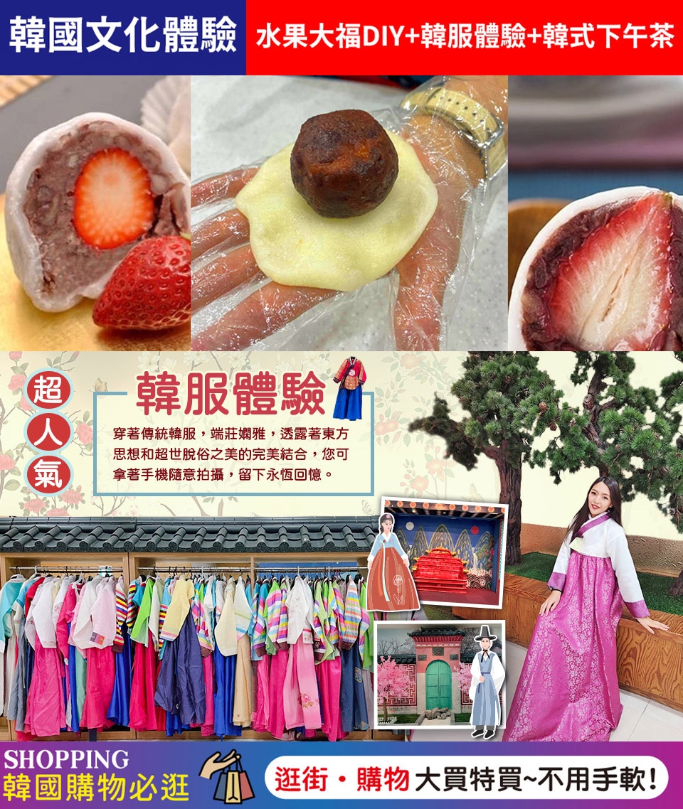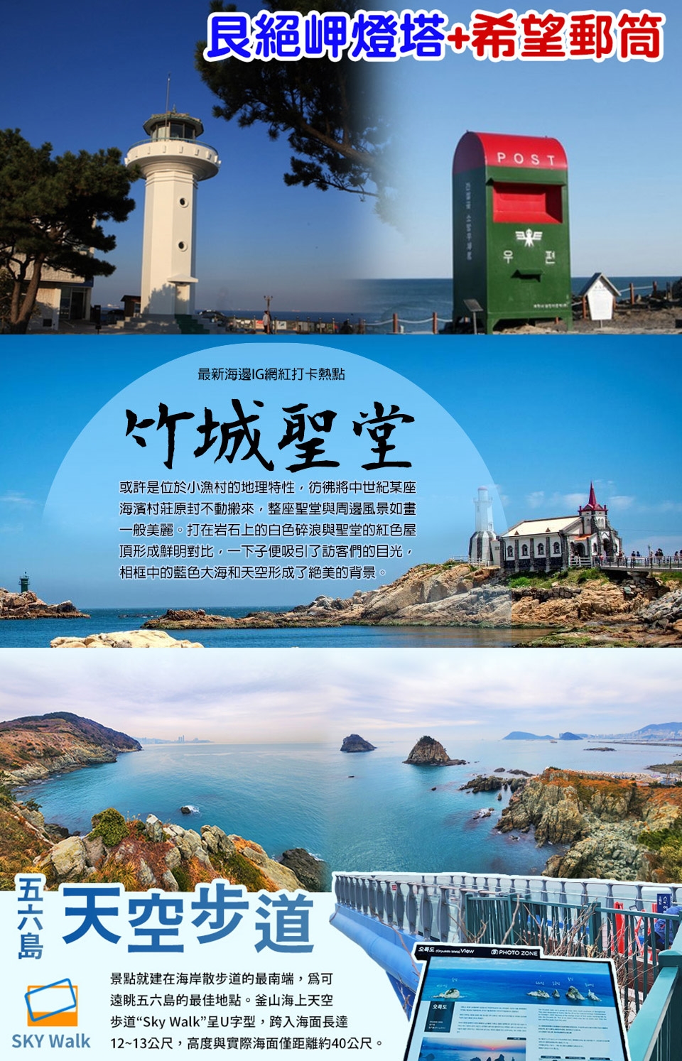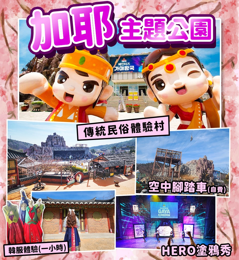 【最新海邊IG網紅打卡熱點~竹城聖堂】聖堂內部設有藝廊,若有幸碰上展覽期間,還能體驗意想不到的樂趣。或許是位於小漁村的地理特性,使其形成了與眾不同的氛圍,彷彿將中世紀某座海濱村莊原封不動搬來,整座聖堂與周邊風景如畫一般美麗。打在岩石上的白色碎浪與聖堂的紅色屋頂形成鮮明對比,一下子便吸引了訪客們的目光。竹城聖堂中最多人排隊等候之處,便是如同架好相框般的拍照區,相框中的藍色大海和天空形成了絕美的背景。 【加耶主題公園】公元42年高句麗、百濟、新羅三國一起在韓半島留下擁有燦爛歷史的伽倻王國,園內占地17萬9千平方公尺包含四季花園、展示館、民俗體驗村、星光庭院、戶外3D影像燈光秀及塗鴉秀,以伽倻文化為主題公園,相傳伽倻國國王金首露王和一位印度阿踰陀國的公主許黃玉聯姻,金首露王愛戴皇后,建了很多美麗的宮殿。整個公園除了可以瞭解當時的歷史,在這裡可以通過遊戲、體驗活動、展覽等來看、來聽、來感受完整的古伽倻的燦爛歷史。 【四季花園】鬱金香、粉紅芒草、菊花等清新的花香,充滿愛的住題公園。 【傳統民俗體驗村】從蛋中出世的金首露王和印度阿踰陀國到來的王妃一起統治的神祕王國,國民居住的房子,有富裕人家的民居,也有平民百姓的簡陋木屋。有很多與伽倻國相關的體驗,比如戰士體驗區、傳統服裝體驗,鐵器體驗區王宮巡禮,也有很多為兒童設置的冒險遊戲區、製作王冠等手工區,還有射箭體驗區等等。 【韓服體驗(一小時)】韓服是自古傳承而來的傳統服飾,至今仍是傳統節日或結婚典禮等重要日子的一種主要服裝。韓服最大的特徵就在於它同時融合了直線與曲線,穿上之後給人一種柔和且優雅的感覺。特別安排貴賓換上新式韓服比起傳統韓服看起來更加華麗精緻,也能更深入了解韓國文化。 【HERO塗鴉秀】非語言公演塗鴉秀[HERO]是一場顛覆大家想像的美術表演塗鴉,將作畫過程原封不動地搬上舞臺,直接呈現在觀眾面前。不僅是韓國最初的的美術公演,也是世界首例。把美術與戲劇、音樂劇結合,約60分鐘的表演裡,演員會將作畫的過程完整呈現給觀眾。以伽倻時代題材各式各樣的素材技巧帶給觀眾們驚喜與感動。 【韓國文化體驗營~水果大福DIY+韓服體驗+韓式下午茶】由專業老師示範講解,麻糬皮、內餡和水果這三個部分來製作做出自己獨一無二的水果大福。「韓服體驗」特別準備傳統韓服供貴賓們換穿,可自由穿搭各種韓劇中常出現的配件,男女古裝均有,搭配布幕背景拍照留念。 【南浦洞時尚鬧區】此地最大的魅力還是在於擁有各種不同流行時尚的購物商品,讓您能盡情購物,享受購物的快感與樂趣。主要街道上的知名品牌、國內外品牌到80%優惠的過季商品大拍賣等暢貨中心,各種您所想像不到的購物商品應有盡有,是購物族的最愛。 早餐:飯店內 午餐:加耶園內套餐(主餐+韓式湯品+韓式小菜) 晚餐:烤肉叔叔(五花肉+烤排骨+里肌肉)+大醬湯+韓式小菜無限量吃到飽食放題 |