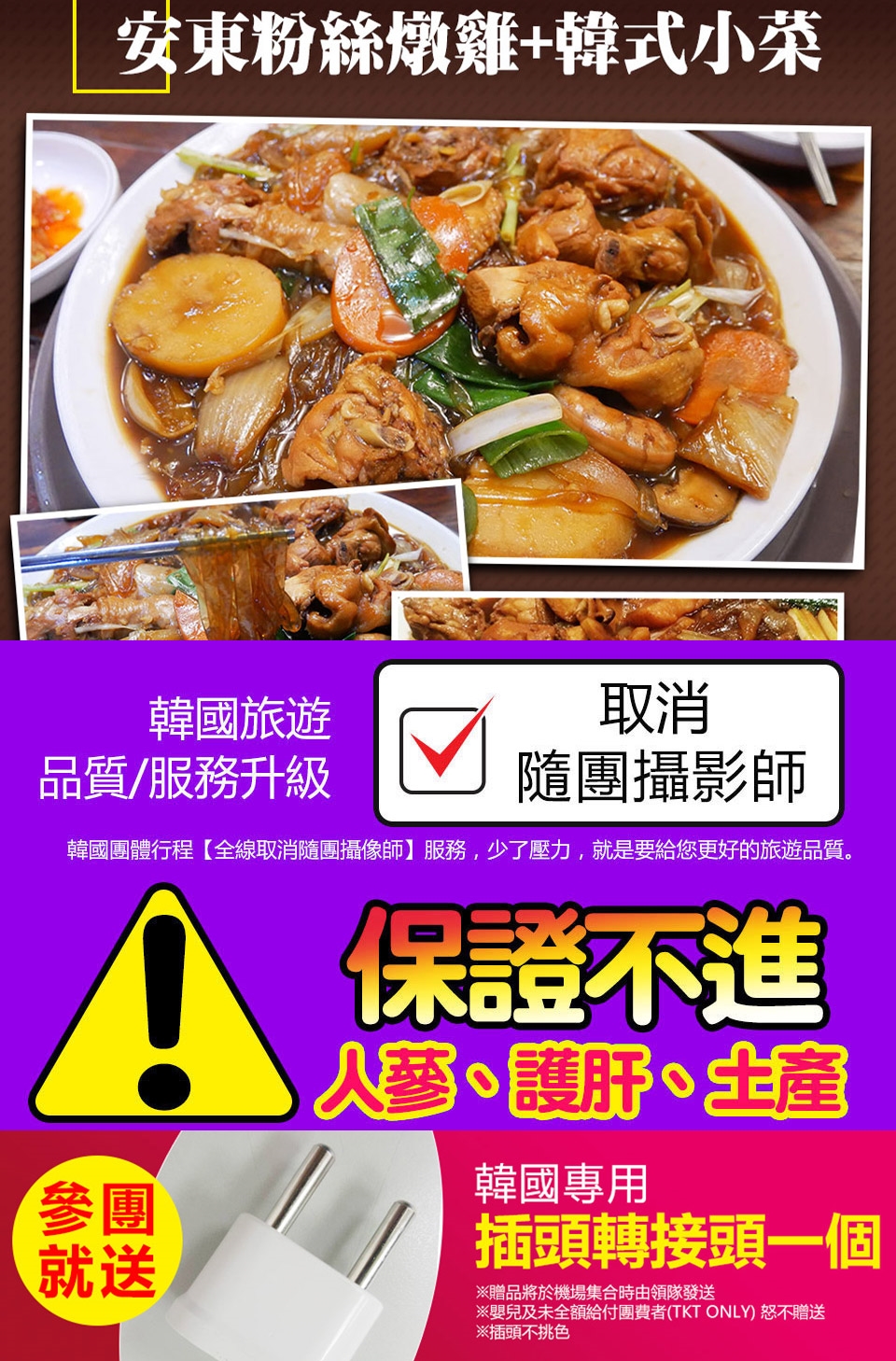 ※韓國飯店及渡假村因響應環保,請自行攜帶牙刷、牙膏、拖鞋、香皂、洗髮精及個人習慣性藥品。