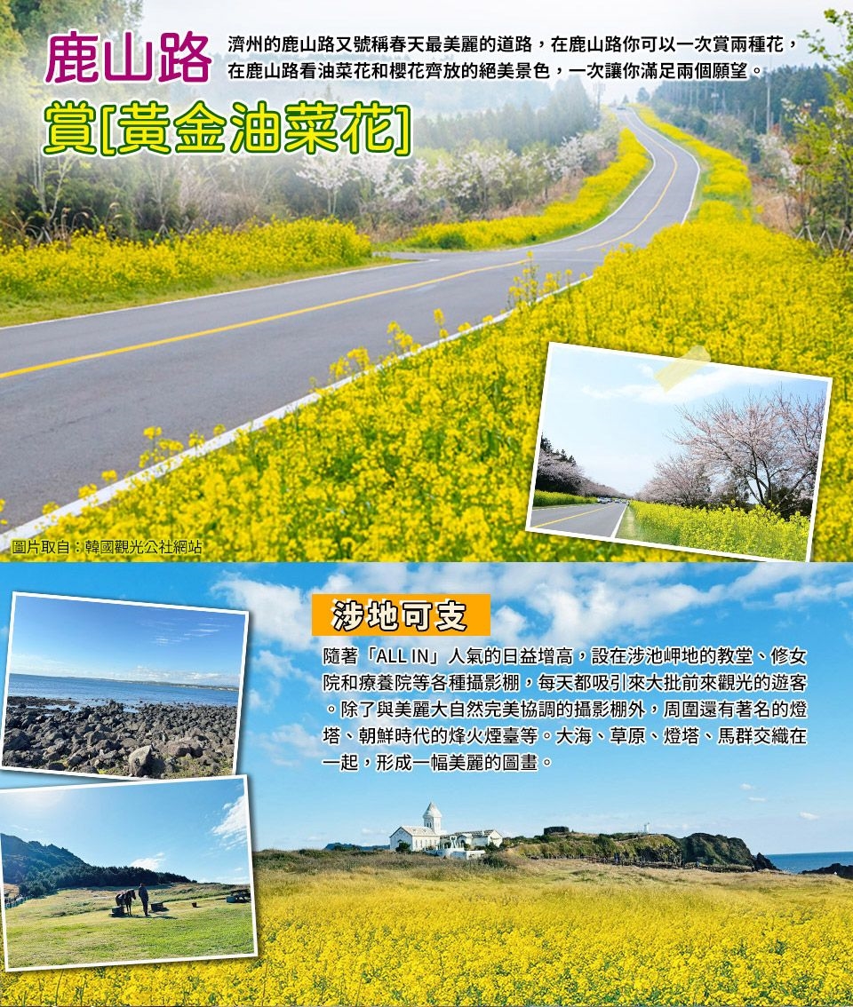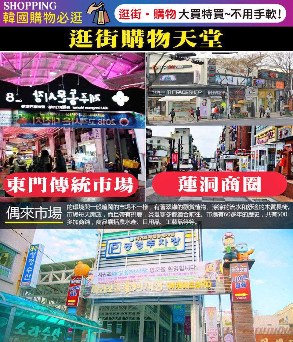 【精裝彩妝坊】相信愛美的女性朋友們ㄧ定可以在這挑選最新款最HITO彩粧品,讓辛苦的上班族及學生族群在忙碌生活中,ㄧ樣可以打造出時尚彩妝,讓您永遠跟上時代潮流尖端。 【城邑民俗村】現有400餘棟房屋,被指定為韓國民俗資料保護區,以茅草覆蓋的屋頂,石頭疊砌的院牆,以及用《丁囊》取代門戶的民宅,質樸可愛,至今仍有人在這裡居住生活,含每人一杯蜂蜜茶或五味子茶2選1,此處有濟州特有的土產:生蜂蜜、五味子茶、馬骨粉。 【最美的鹿山路賞花黃金油菜花】濟州的鹿山路又號稱春天最美麗的道路,在鹿山路你可以一次賞兩種花,在鹿山路看油菜花和櫻花齊放的絕美景色,一次讓你滿足兩個願望! 【噢!雪綠茶博物館】雪綠茶博物館O雪綠位於濟州島西廣茶園附近,是以「綠茶」為主題,讓旅客們深入了解有關韓國傳統茶文化的學習空間。特別是博物館名稱中的「O」含有輕快讚嘆的涵義存在(origin of sulloc, only sulloc, of sulloc cha)。 博物館於2001年9月1日開幕,不僅因建築物整體以綠茶杯造型而出名,更是結合傳統與現代的文化空間,亦是貼近大自然的休憩空間。博物館內部有庭院與池塘,而建築物2樓還設有觀景臺,可以眺望綠茶田與周邊自然景觀。 【全新開幕~水之幻境水世WATER WORLD】是韓國首個以「水」打造而成的沉浸式媒體主題樂園,擁有充滿個性的媒體藝術與各種文化內容。內部共規劃為12個主題空間,提供極具獨創性的概念設計與高品質的特別體驗。這裡一年四季都可盡情遊覽,在秋冬兩季還會貼心提供溫水。每個空間還備有精緻的拍照區,方便在此留下美好回憶。 【偶來市場】的環境與一般喧鬧的市場不一樣,有著翠綠的觀賞植物、淙淙的流水和舒適的木質長椅。市場每天開放,而且帶有拱廊,炎夏寒冬都適合前往。市場有60多年的歷史,共有500多加商鋪,商品囊括農水產、日用品、工藝品等等。其中鮑魚、鯛魚、漢拿峰柑橘、濟州巧克力是人氣產品。 早餐:飯店內 午餐:黑毛豬肉魷魚壽喜燒+小菜吃到飽 晚餐:方便逛街 敬請自理 |