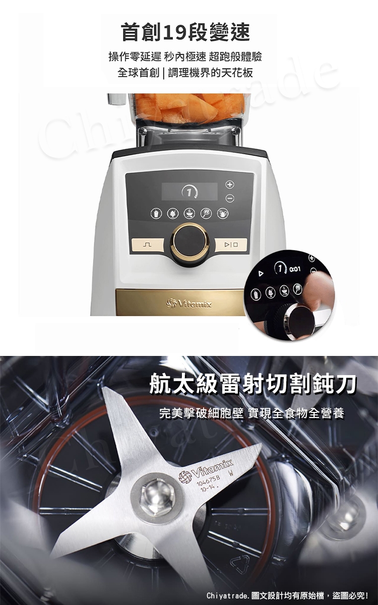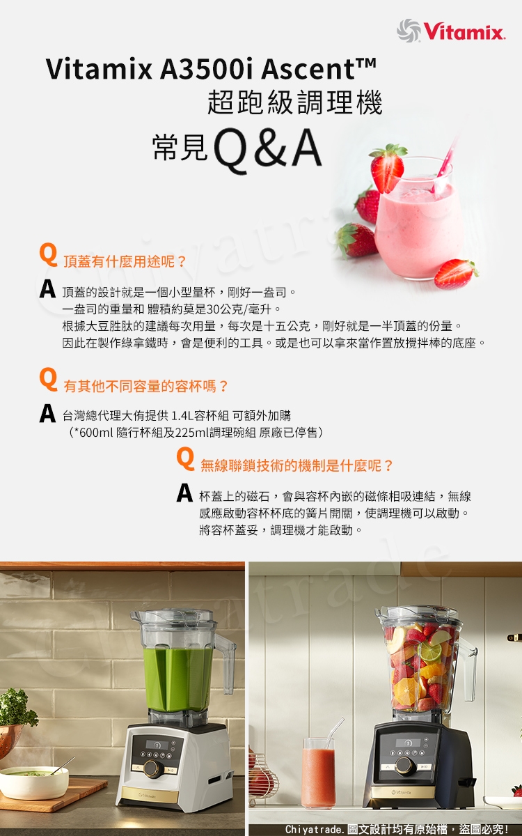 A3500i能自動感應容杯尺寸,自主偵測不同的容杯所需要的調理時間,並透過無線連接鎖定杯蓋,當容杯未鎖緊時,無法運轉。調理中途開啟杯蓋,調理機自動停止,調理更放心。