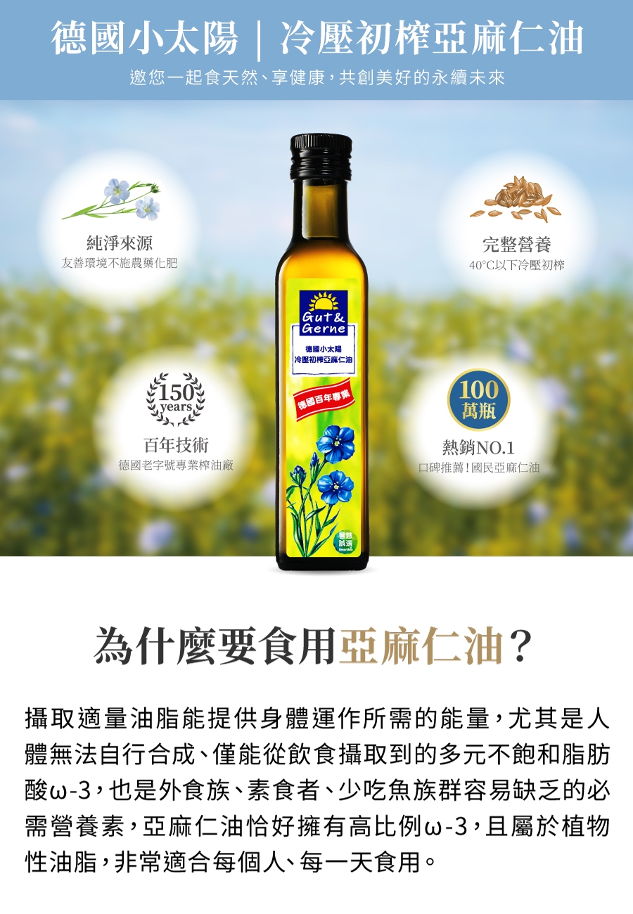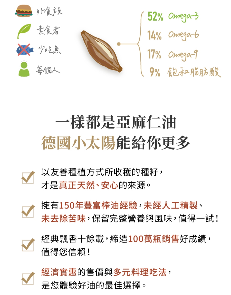 德國小太陽冷壓初榨亞麻仁油。