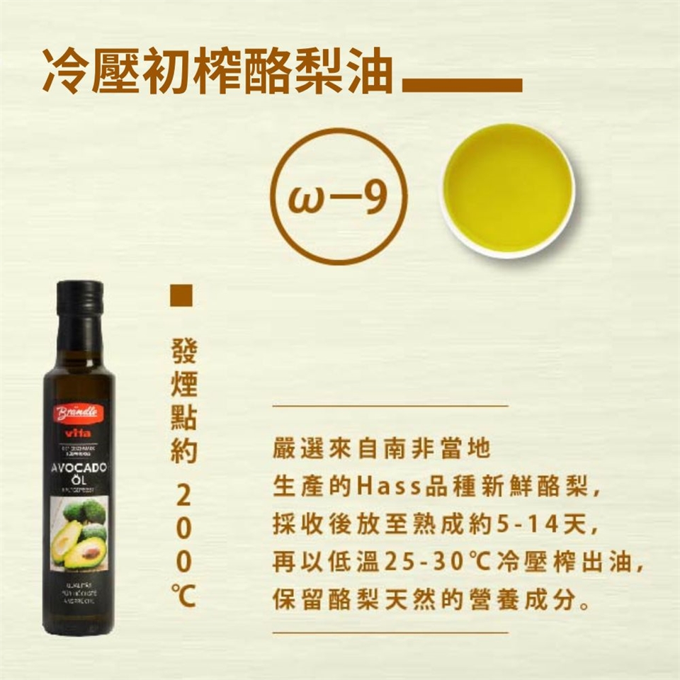 以低溫25-30℃冷壓榨出油,保留酪梨天然的營養成分。