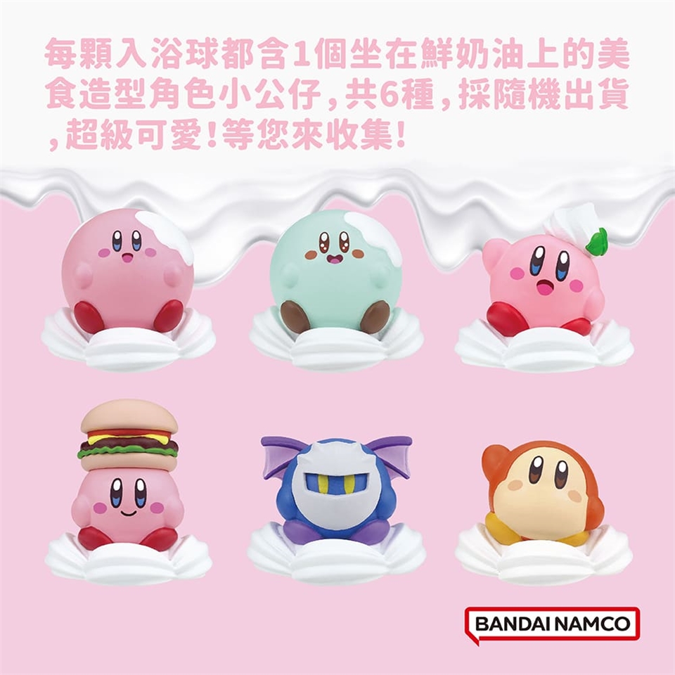 每顆入浴球都含1個坐在鮮奶油上的美食造型角色小公仔,共6種,採隨機出貨,將入浴球放入水中,用蓮蓬頭對沖,