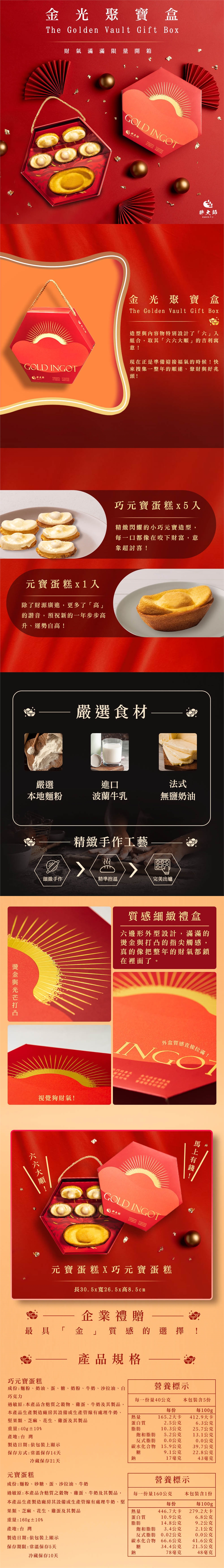 金光聚寶盒以象徵財富好運的金元寶為靈感,內含巧元寶蛋糕5入與大顆元寶蛋糕1入,口感鬆軟細緻、香甜不膩。精緻禮盒設計,寓意聚財納福、金銀滿袋,是年節送禮、開工祝賀與親友分享的最佳選擇。