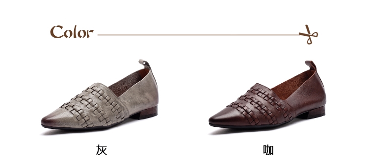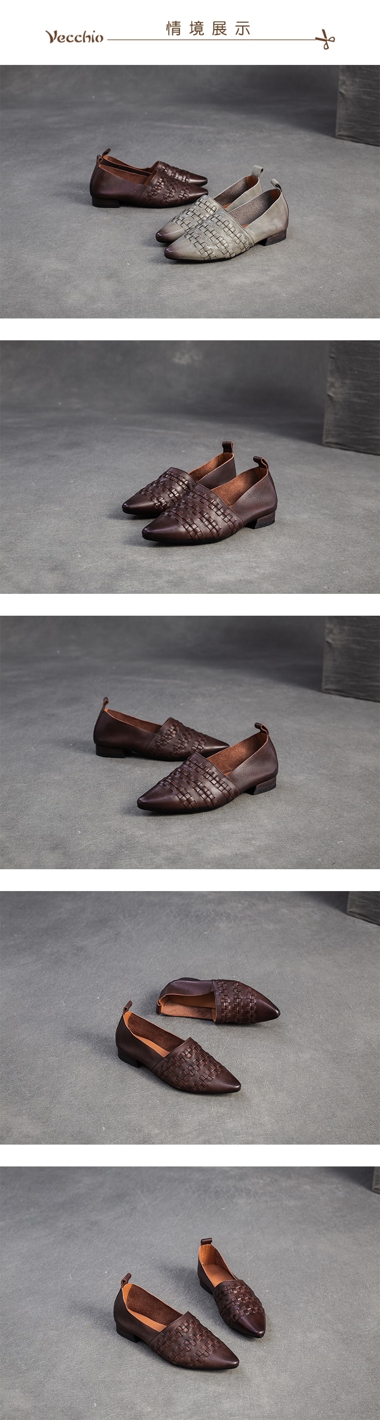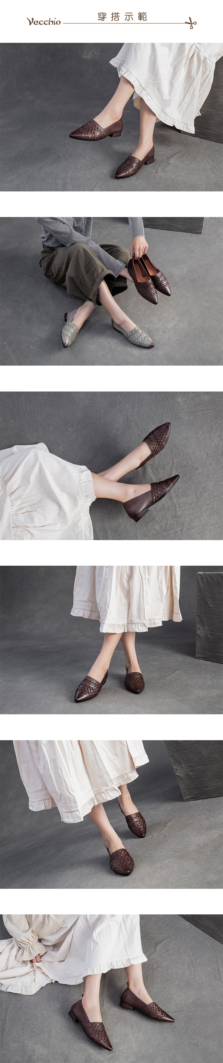 【VECCHIO】全真皮編織低跟樂福鞋/全真皮水染牛皮編織設計小尖頭低跟樂福鞋 女鞋 咖