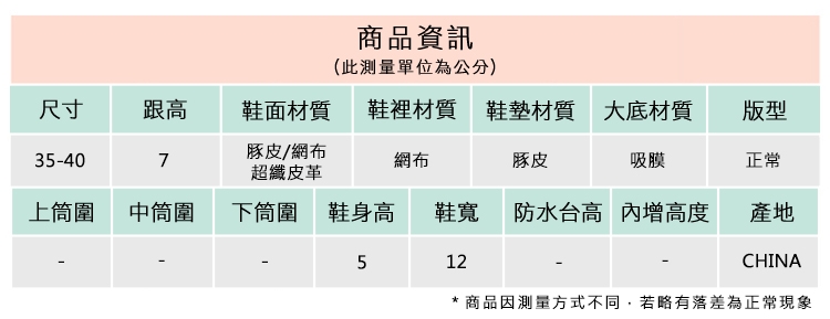 2.鞋類商品依功能及用途之不同,鞋底各有其止滑係數之個別不同,使用鞋類商品請用於正常平坦之路面,非雨鞋或雨靴類商品,請避免穿著於下雨濕滑路面上行走。