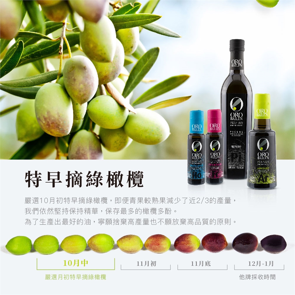 ▮嚴選每年十月特早摘青綠橄欖,果實離枝兩小時內即完成第一道冷壓榨取。