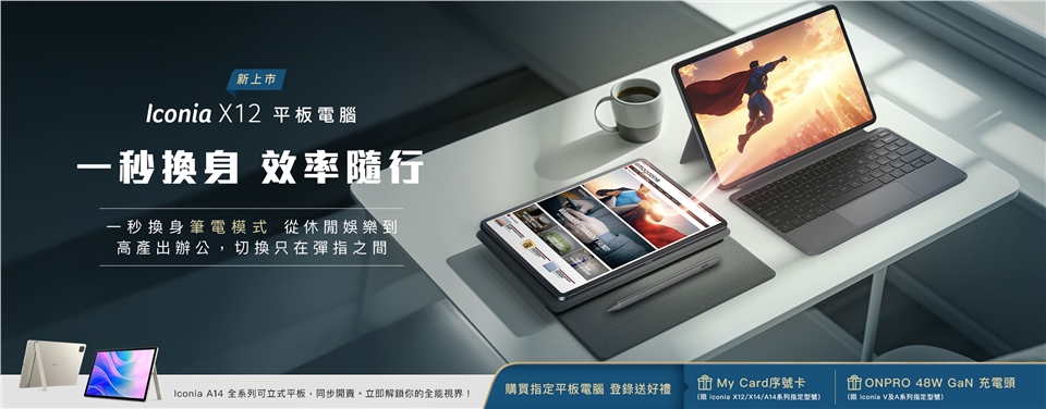購買Iconia X12/X14/A14系列指定型號,登錄即送【My Card序號卡 (市價$500元)】。