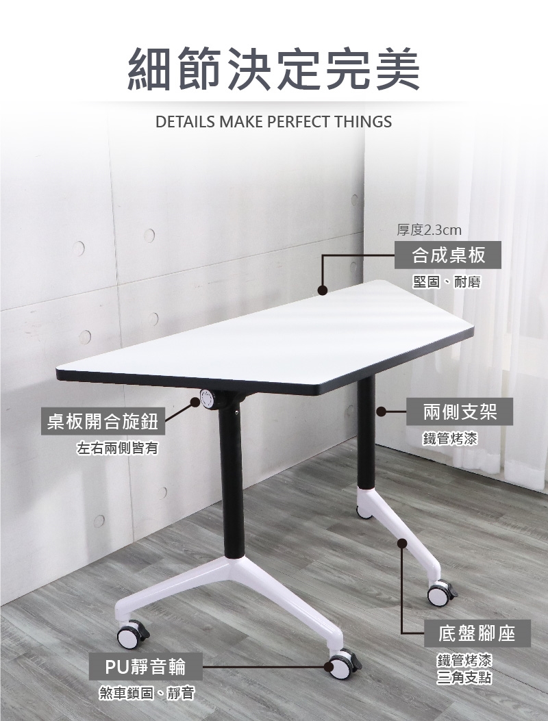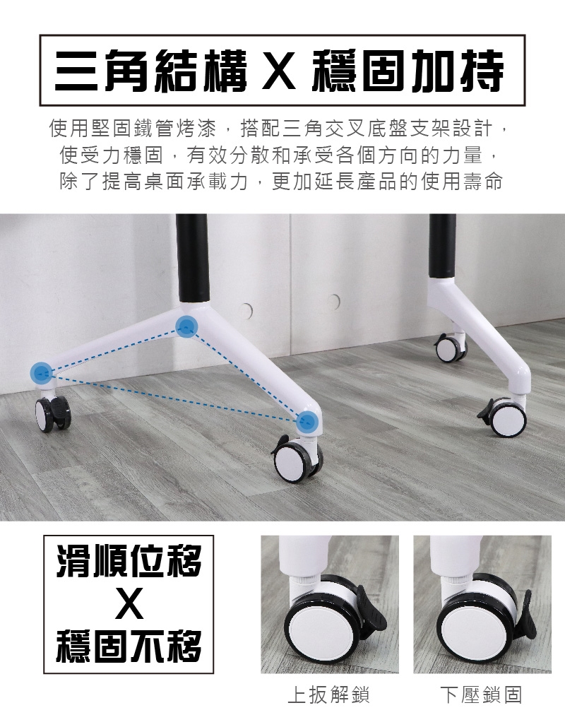 ✔使用堅固鐵管烤漆,搭配三角交叉底盤支架設計,使受力穩固,有效分散和承受各個方向的力量,除了提高桌面承載力,進而延長產品的使用壽命