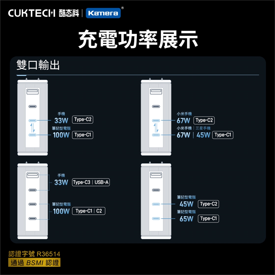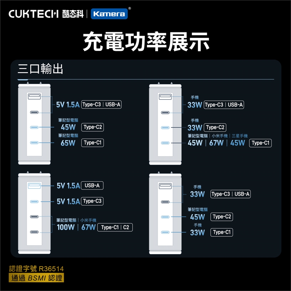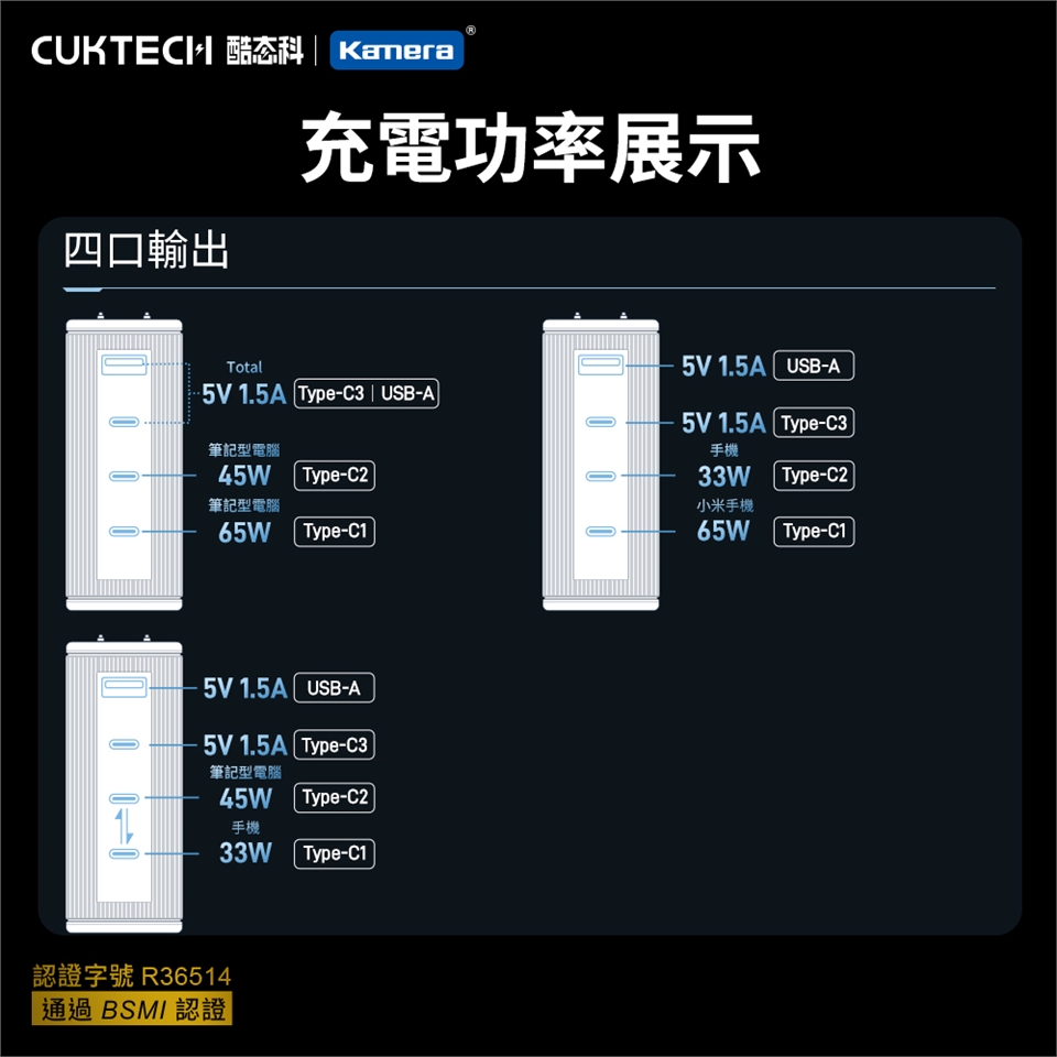 C1+C2+(C3+A)輸出:65W+60W+7.5W MAX or 45W+45W+5V⎓3A MAX