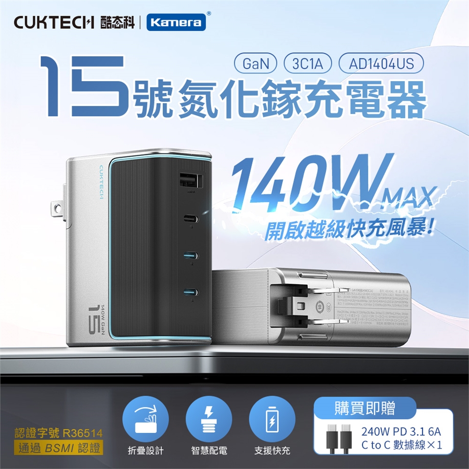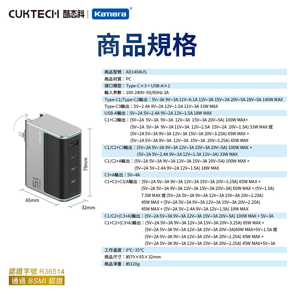 - 140W大功率氮化鎵科技:採用先進氮化鎵(GaN)技術,使充電器體積更小、效率更高。最高輸出功率達140W,能快速為筆記型電腦、智慧手機及其他裝置提供強大電力,實現高速充電同時降低發熱。