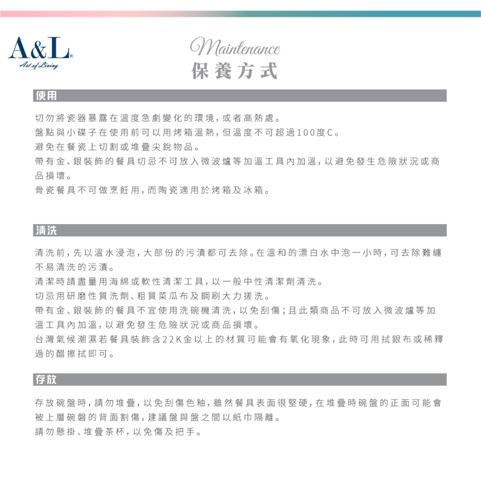 @請勿堆疊,以免刮傷色釉,雖然餐具表面很堅硬,在堆疊時碗盤的正面可能會被上層碗磐的背面割傷,建議盤與盤之間以紙巾隔離。