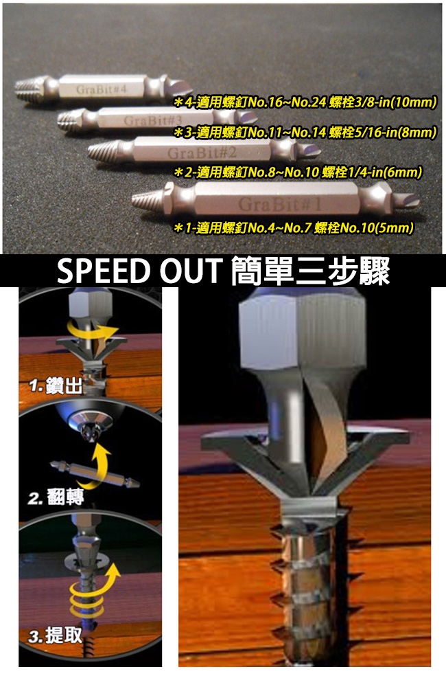 提取一個螺釘或螺栓SpeedOut可以在2個簡單的步驟輕鬆完成: