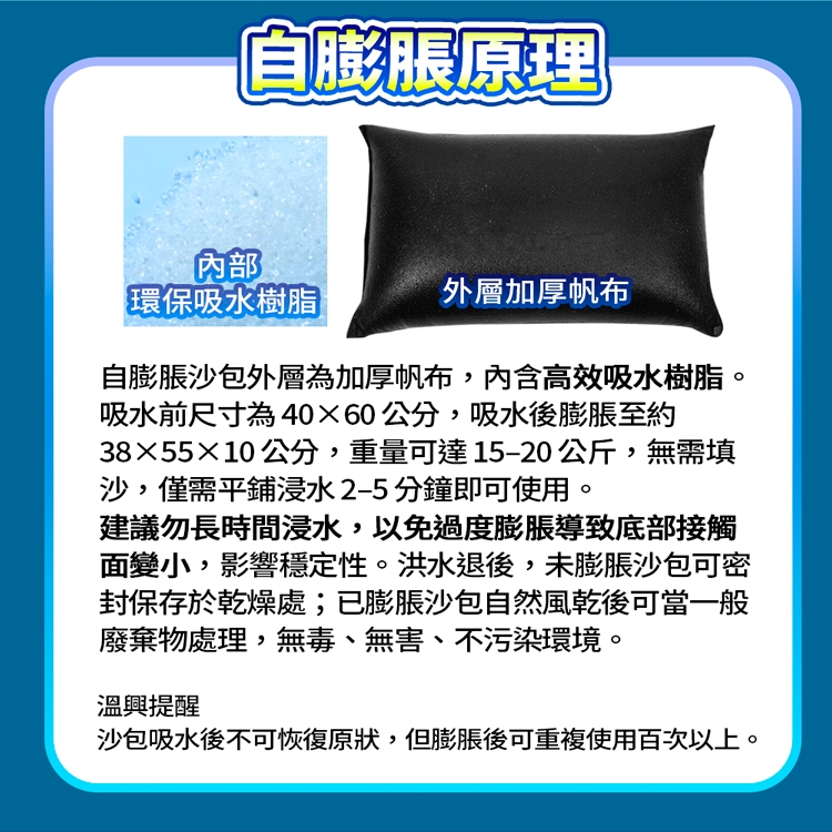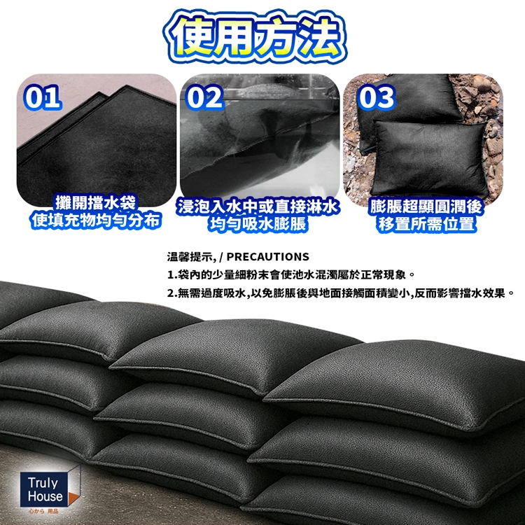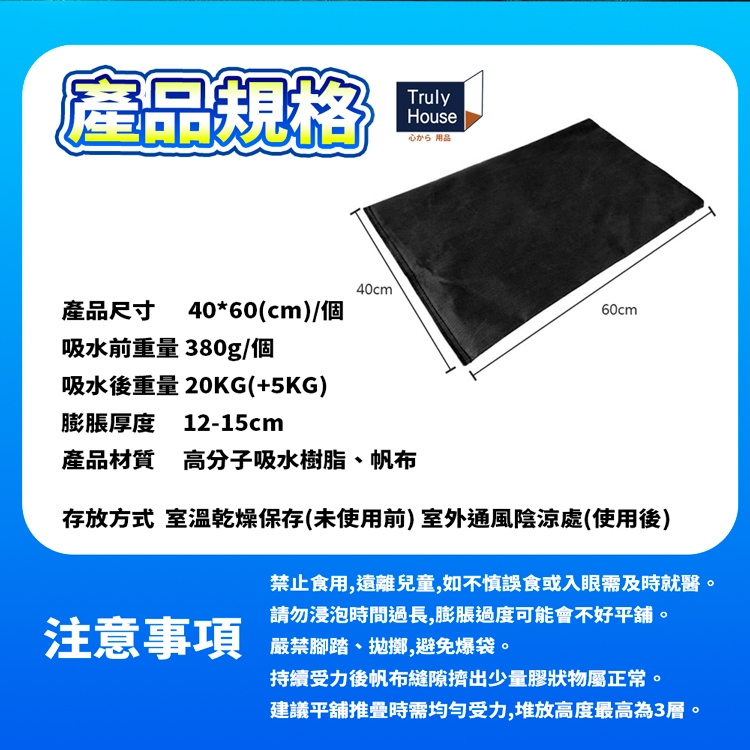 禁止食用,遠離兒童,如不慎誤食或入眼需及時就醫。 請勿浸泡時間過長,膨脹過度可能會不好平舖。 嚴禁腳踏、拋擲,避免爆袋。 持續受力後帆布縫隙擠出少量膠狀物屬正常。 建議平舖推疊時需均勻受力,堆放高度最高為3層。