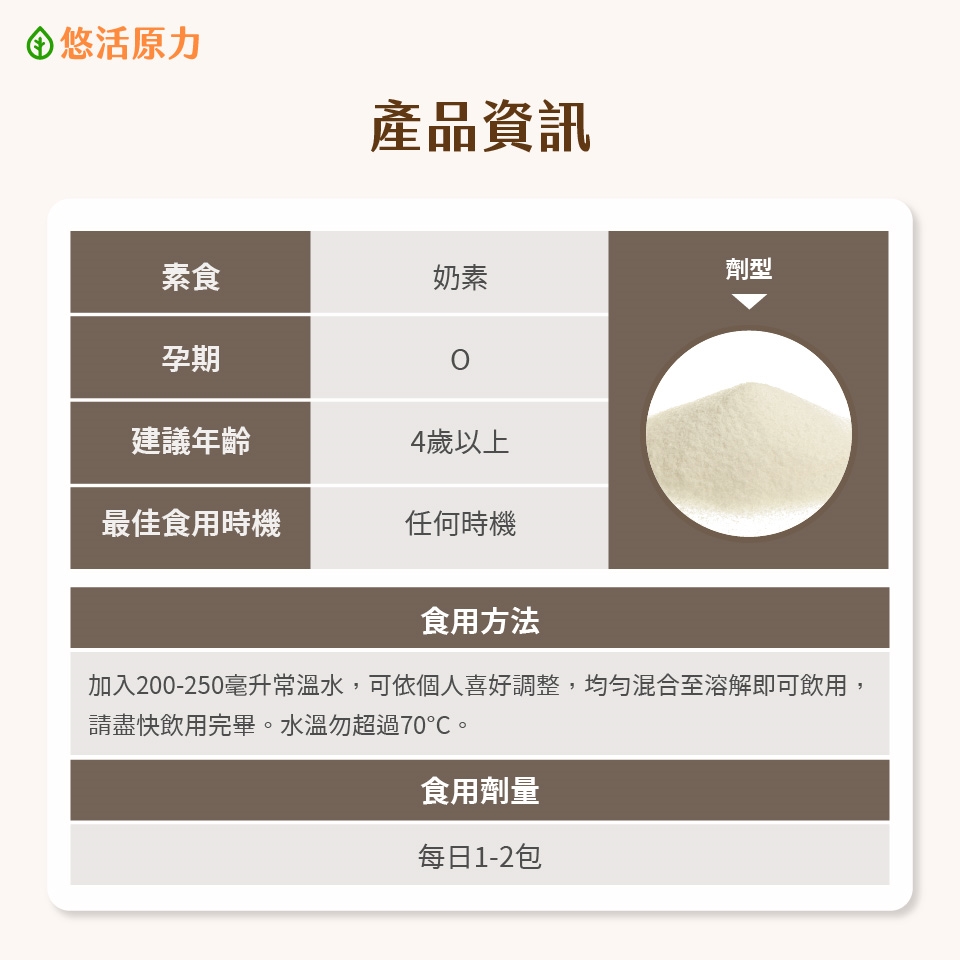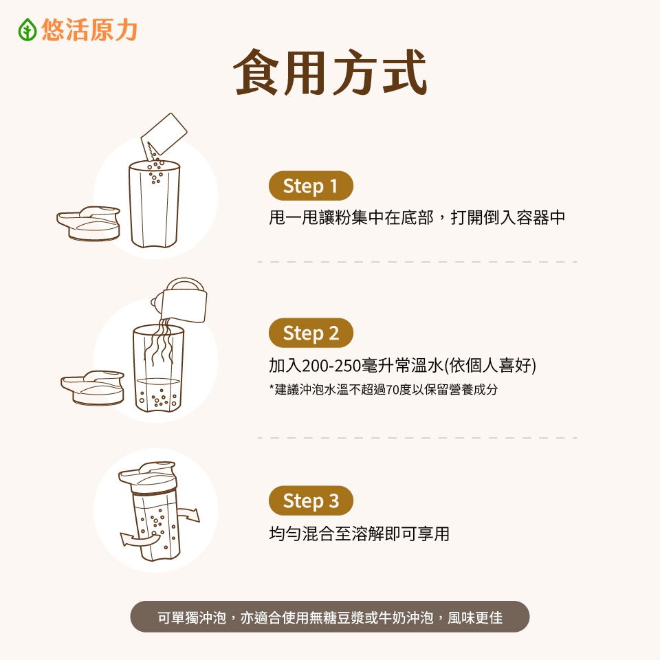 每日1-2包,加入200-250毫升常溫水,可依個人喜好調整,均勻混合至溶解即可飲用,請盡快飲用完畢。建議沖泡水溫不超過70°C。