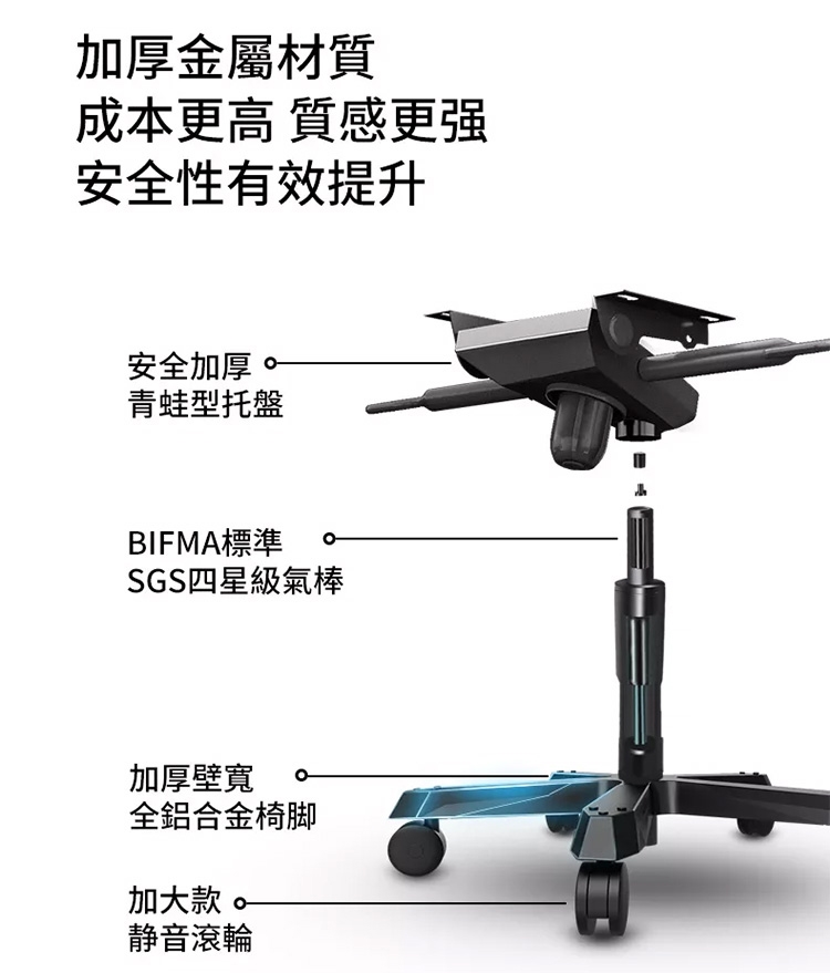 Craft工藝Series電競椅,採用直徑70CM鋁合金腳座,單腳座規格最高可以承重約140KG(本款座椅主體,最大載重為125kg)!