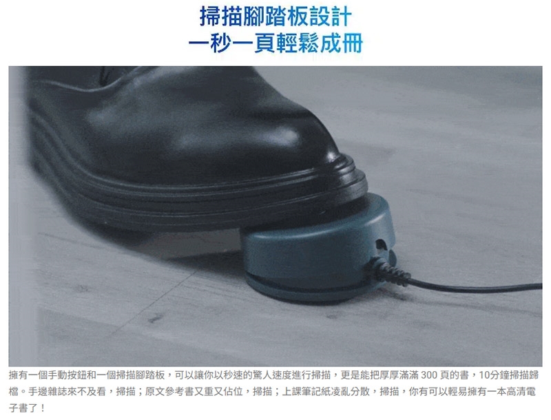 擁有一個手動按鈕和一個掃描腳踏板,可以讓你以一頁一秒的驚人速度進行掃描