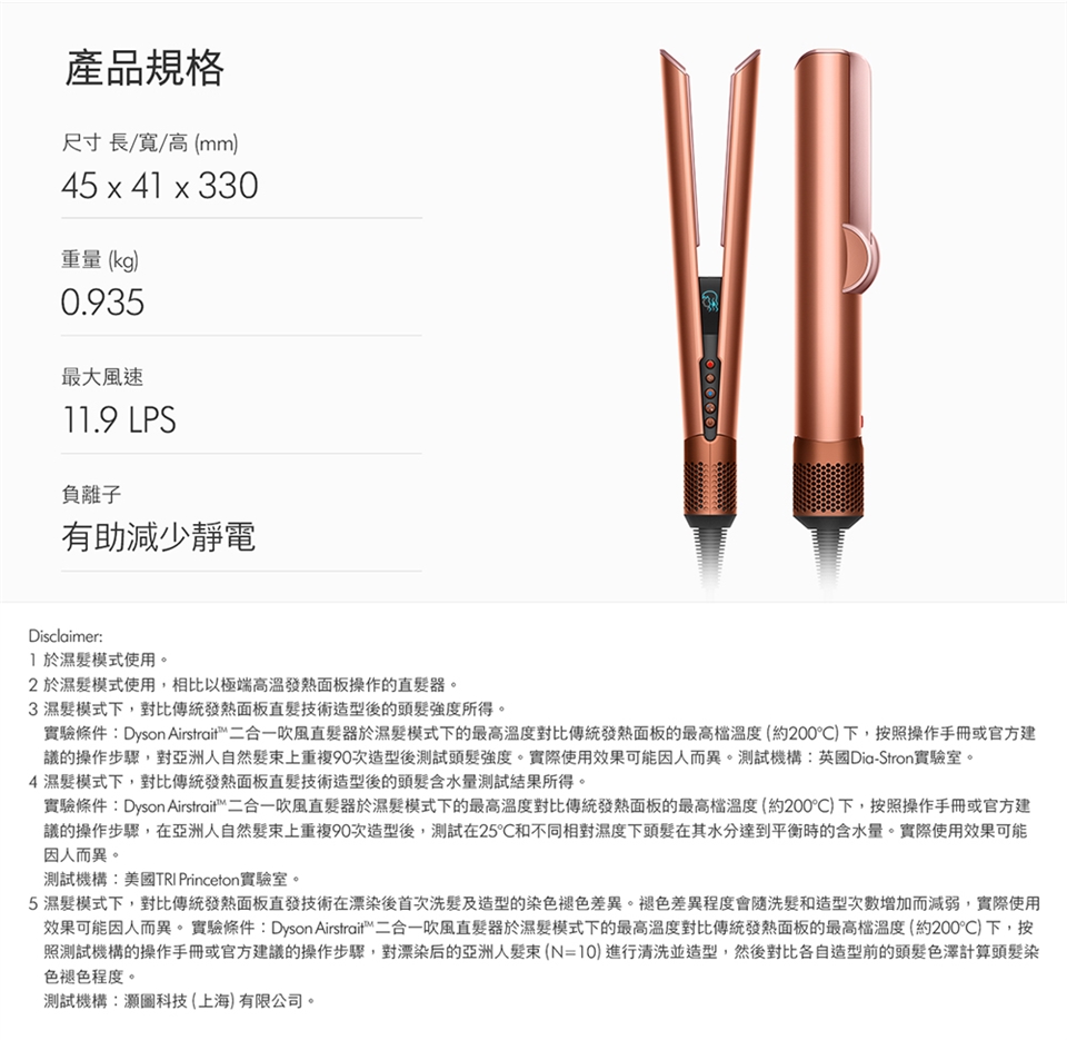 3. 乾濕兩用省時省心:不依賴加熱面板,無熱傷害: 傳統加熱式直髮器,利用高溫造型易造成頭髮斷裂乾枯。Dyson二合一吹風直髮器,提升髮絲強韌度60% / 水潤度28%/ 染髮退色60%