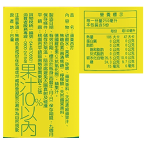 內容物成份 碳酸水、果糖、砂糖、天然濃縮蘋果汁、蘋果汁、焦糖色素(普通焦糖)、天然蘋果香料、蘋果香料