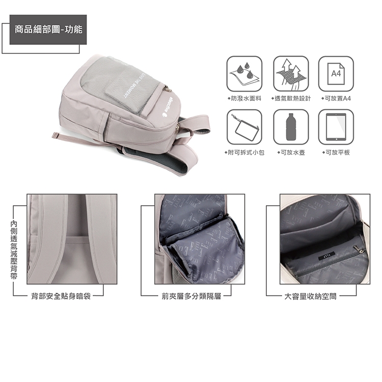 內拉鍊暗袋-1;3C保護層-1;側邊水壺袋-2;後拉鍊收納袋-1;