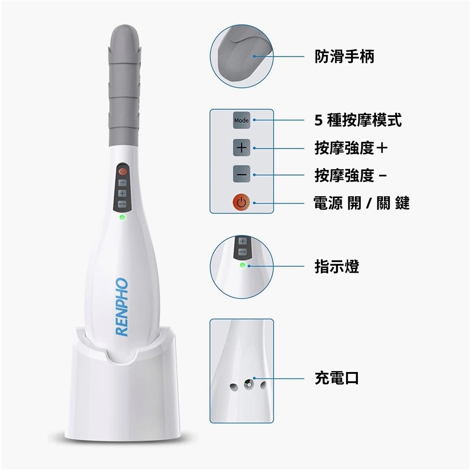 RENPHO 無線手持按摩器配有 2600mAh 高品質鋰電池,充滿電後可使用時間長達 140 分鐘。另設 20 分鐘自動計時按摩功能,保護肌肉,避免使用過度。