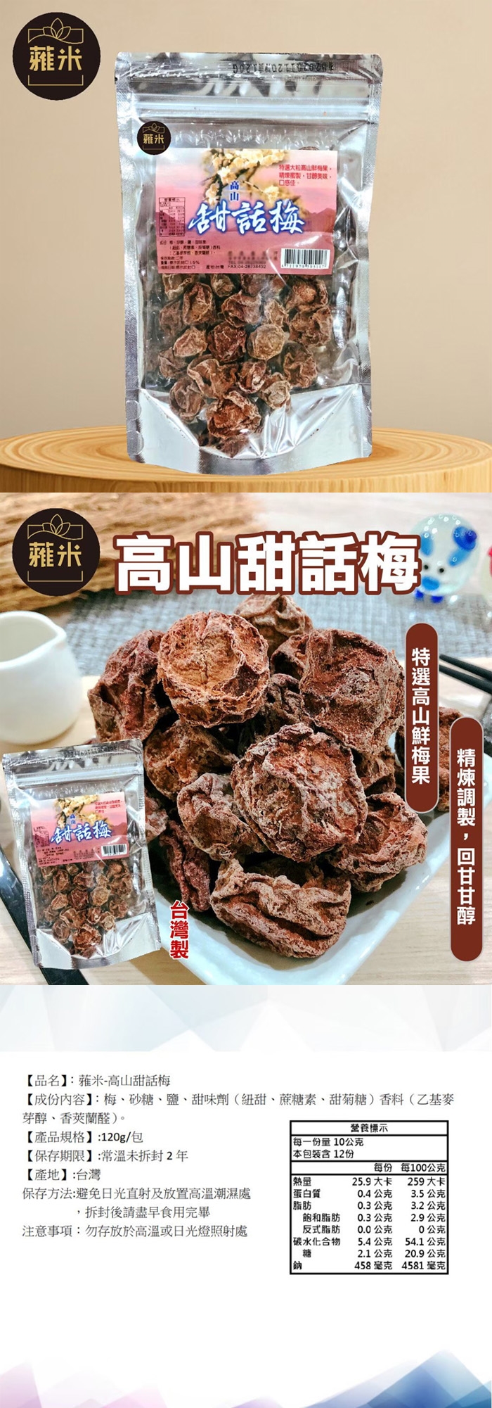 成份: 梅、砂糖、鹽、甜味劑(紐甜、蔗糖素、甜菊糖)、香料(乙基麥芽醇、香莢蘭醛)