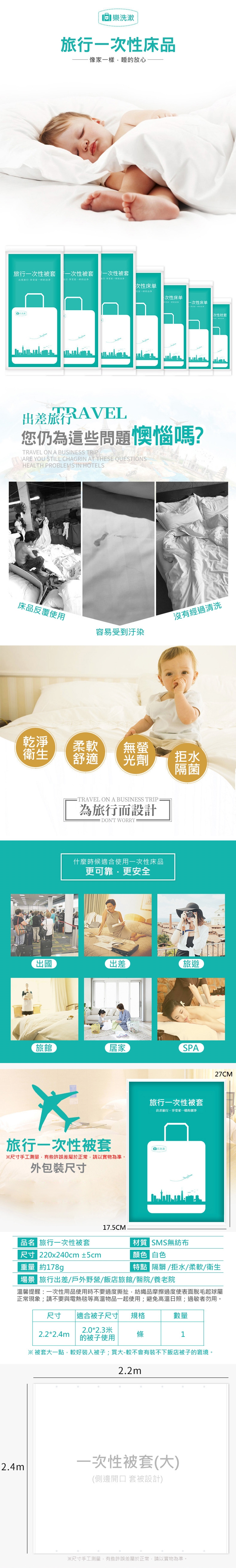 被套、枕套、床單都是獨立包裝設計,乾淨衛生 拆開即可直接使用,不佔太多行李空間