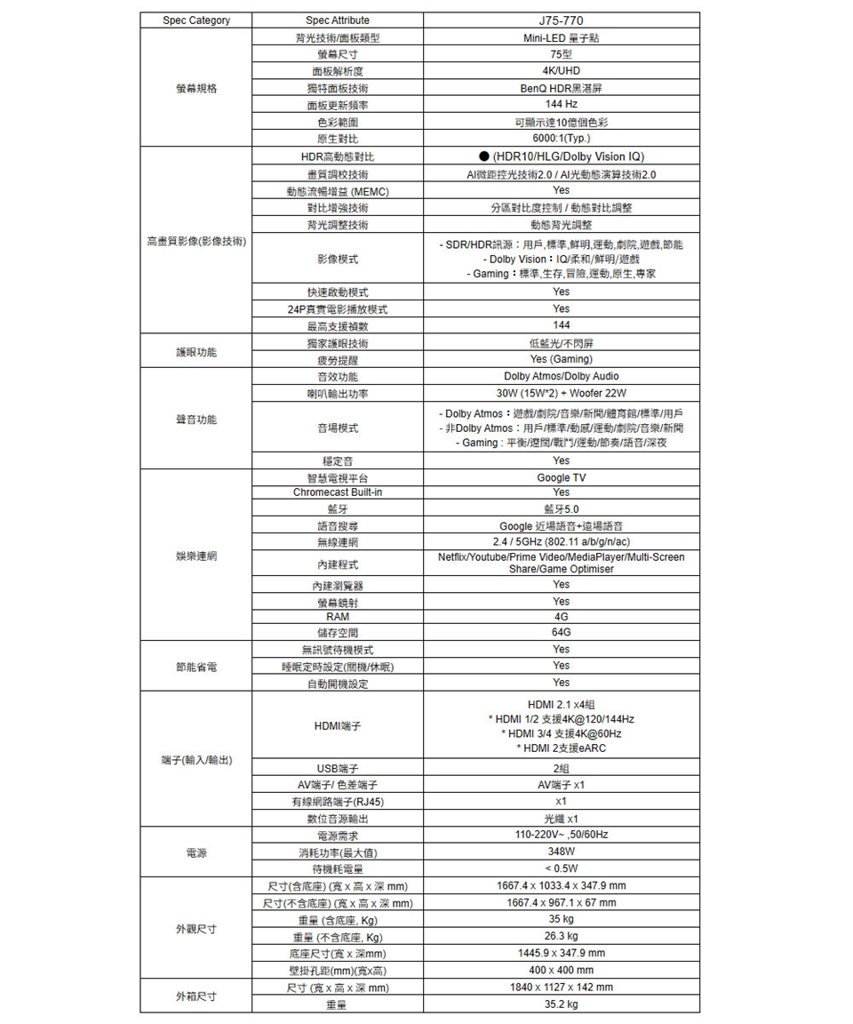 BenQ 75吋4K MiniLED量子點遊戲Google TV液晶顯示器144Hz(J75-770)