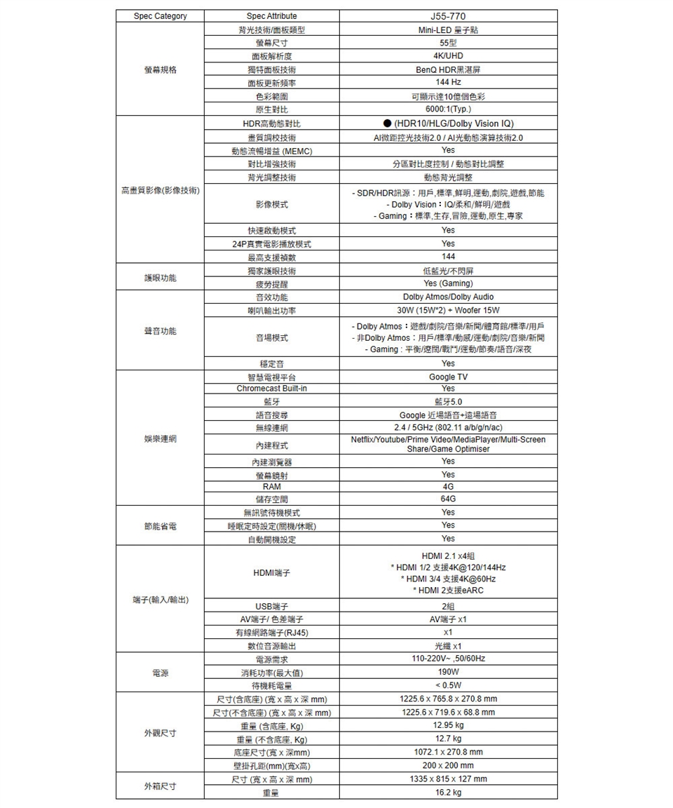 BenQ 55吋4K MiniLED量子點遊戲Google TV液晶顯示器144Hz(J55-770)