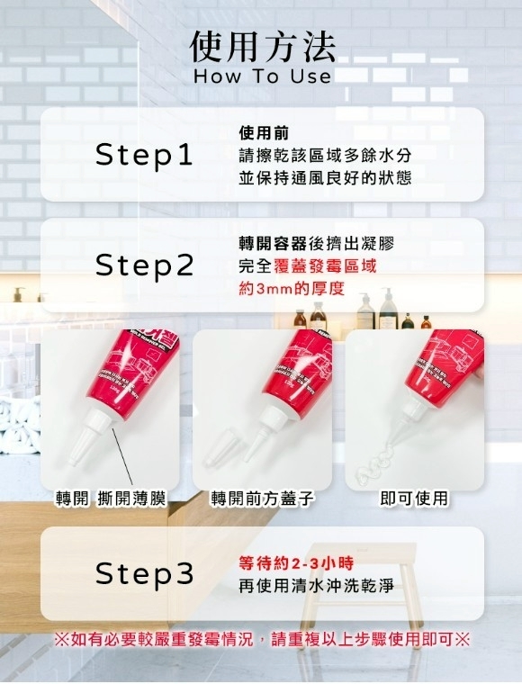 將開蓋後擠出凝膠,完全覆蓋發霉區域約 3mm 的厚度。