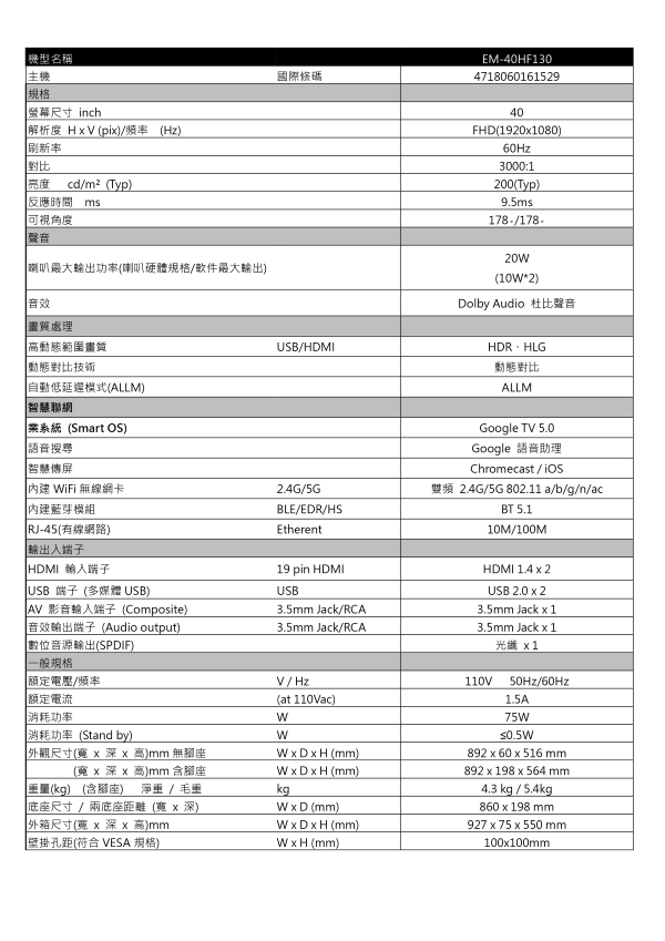 SAMPO 聲寶 40吋 FHD Smart LED 液晶顯示器 EM-40HF130