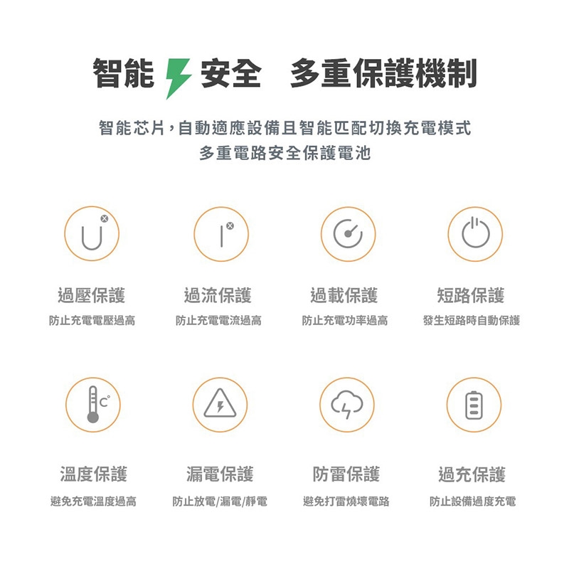 ◎ 防過充/過電壓/過電流/輸出短路/輸出過載/溫度保護/過功率/電磁場保護 八大安全防護。